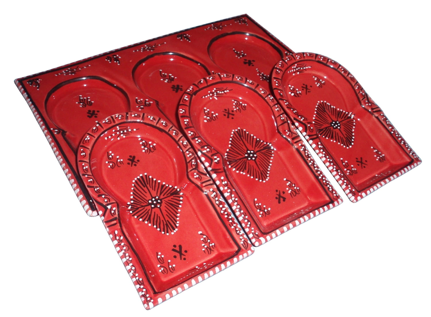 Ten ceramiczny komplet na przekąski zawiera aż 4 części: podstawkę (talerz o wymiarach 33/22cm), 3 prostokątne miseczki o wymiarach 17,5cm/10,5cm.