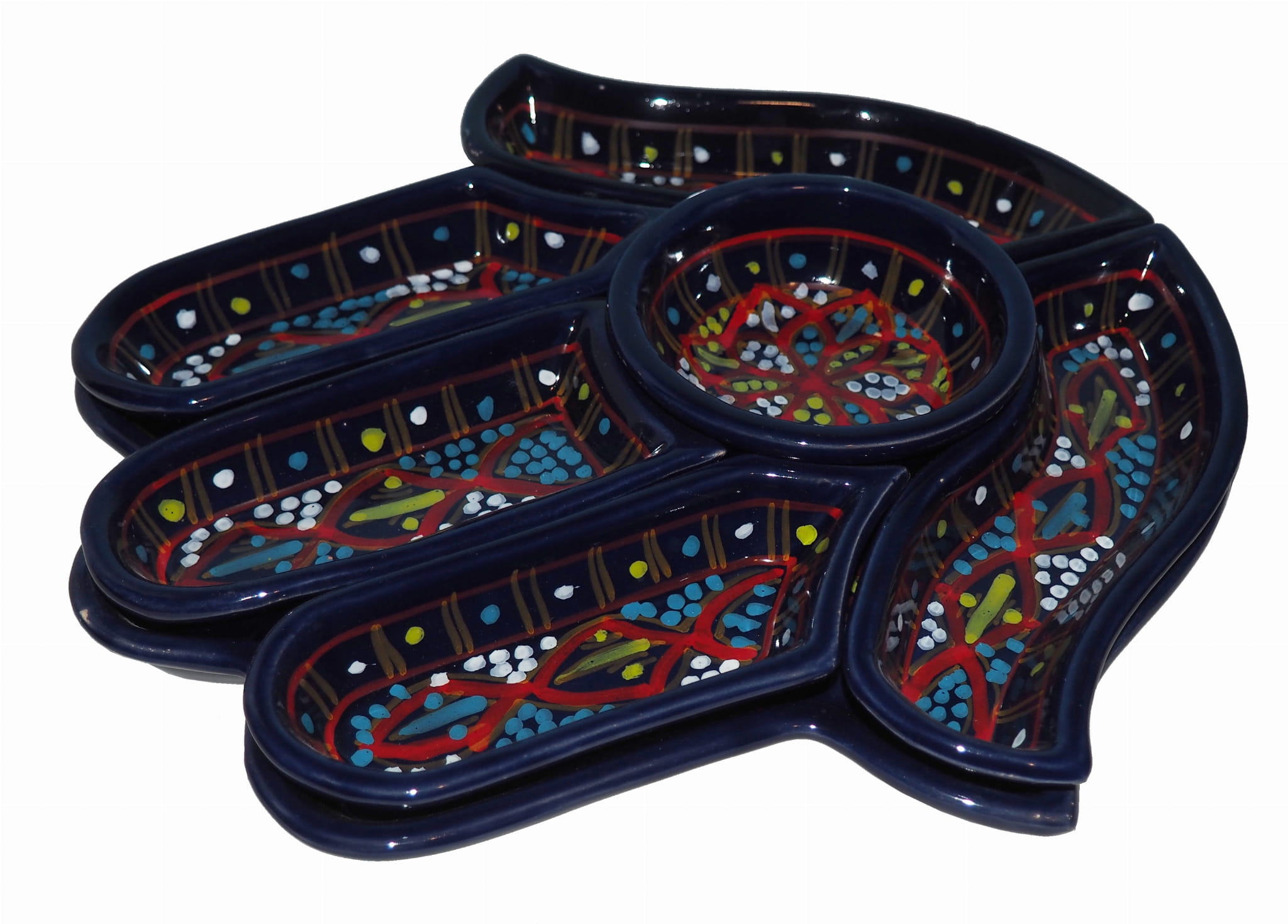 Ten ceramiczny komplet na przekąski zawiera aż 7 części: podstawkę - talerz w kształcie dłoni Fatimy o wymiarach, 5 miseczek, okrągłą miseczkę.