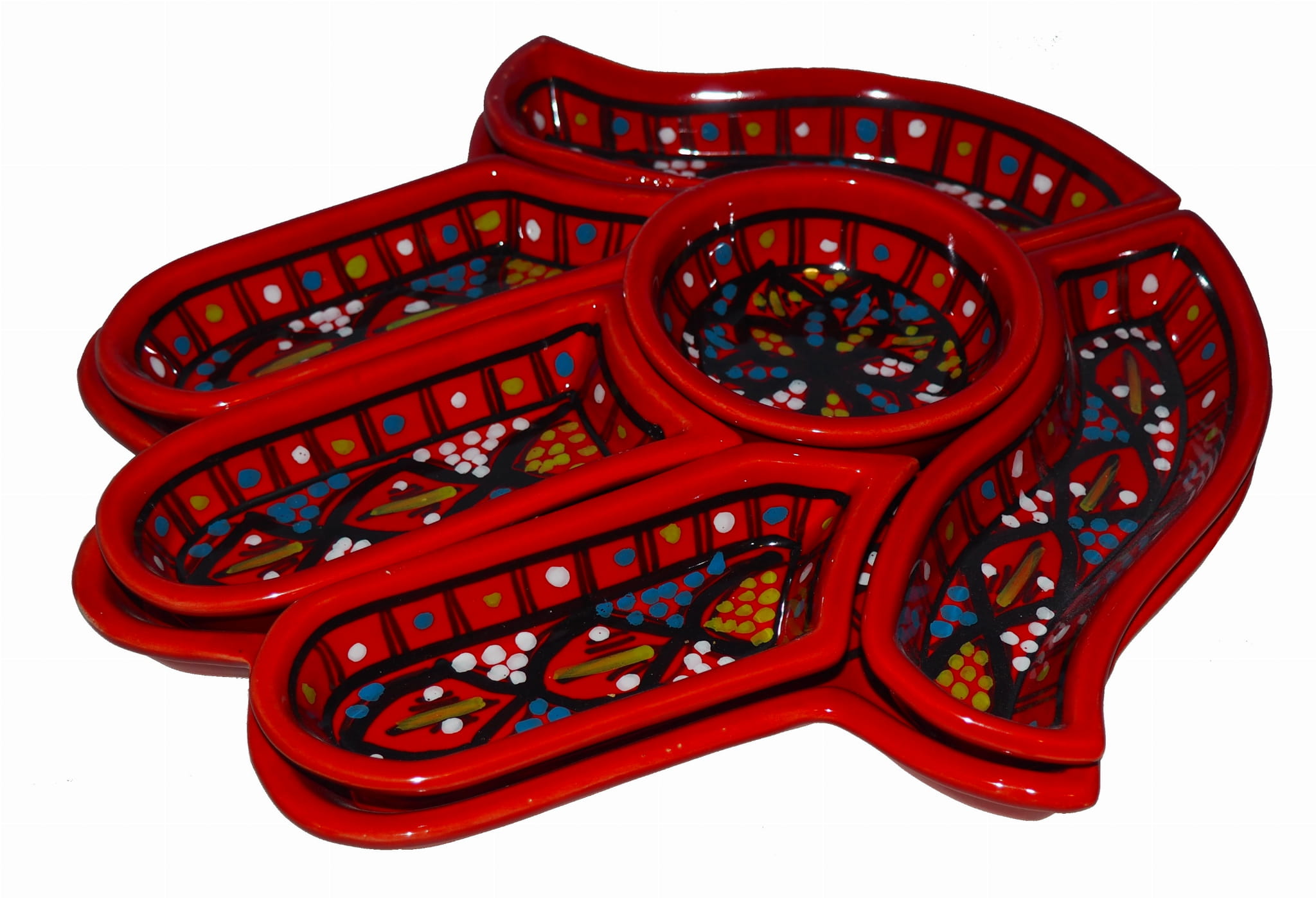 Ten ceramiczny komplet na przekąski zawiera aż 7 części: podstawkę - talerz w kształcie dłoni Fatimy o wymiarach, 5 miseczek, okrągłą miseczkę.