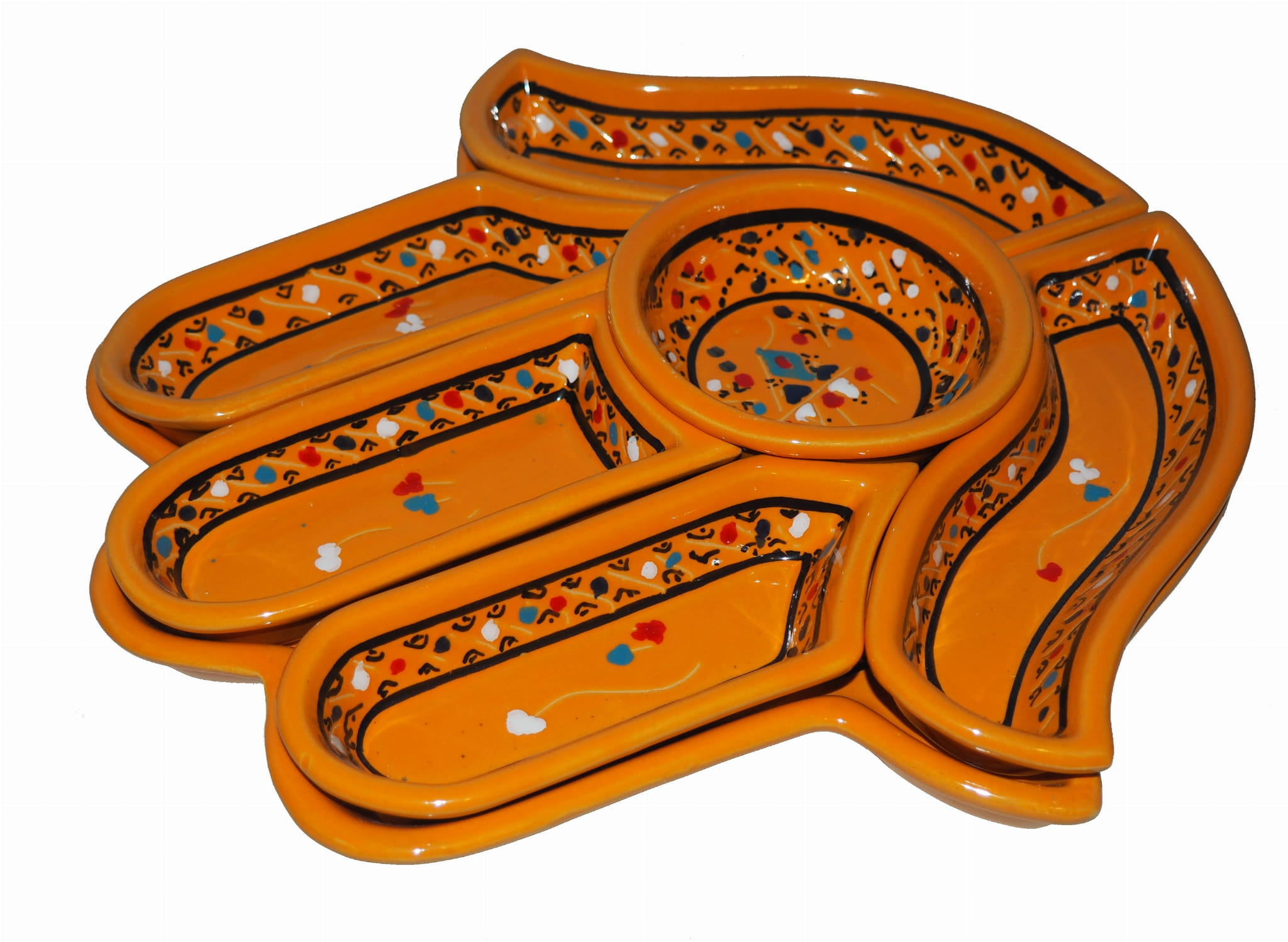 Ten ceramiczny komplet na przekąski zawiera aż 7 części: podstawkę - talerz w kształcie dłoni Fatimy o wymiarach, 5 miseczek, okrągłą miseczkę.