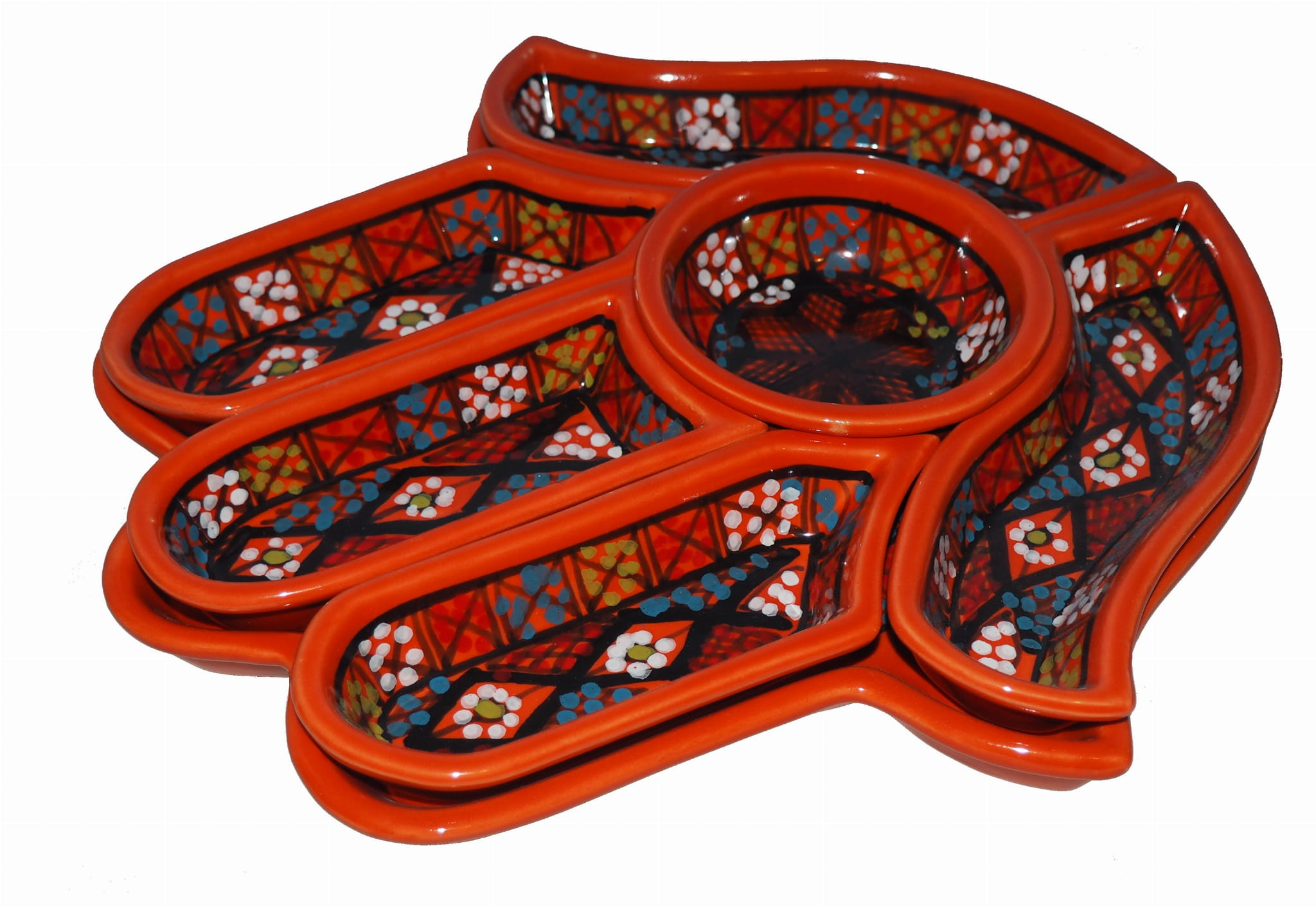 Ten ceramiczny komplet na przekąski zawiera aż 7 części: podstawkę - talerz w kształcie dłoni Fatimy o wymiarach, 5 miseczek, okrągłą miseczkę.