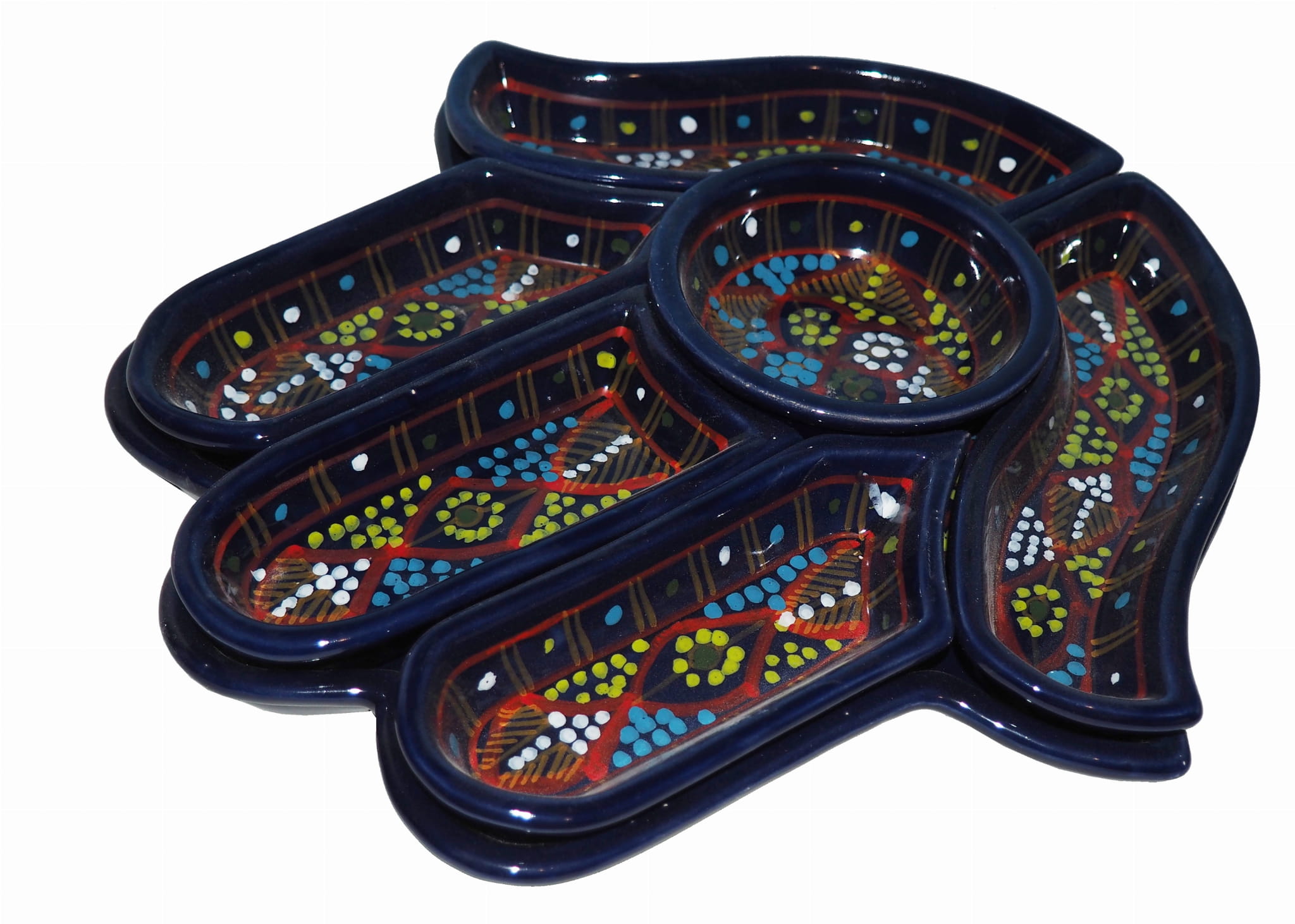Ten ceramiczny komplet na przekąski zawiera aż 7 części: podstawkę - talerz w kształcie dłoni Fatimy o wymiarach, 5 miseczek, okrągłą miseczkę.