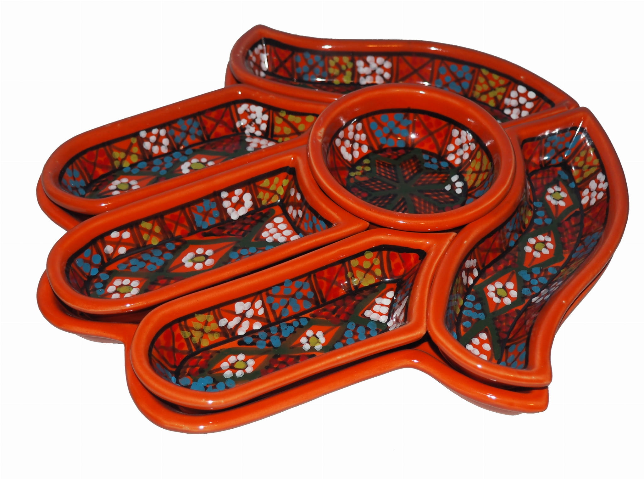 Ten ceramiczny komplet na przekąski zawiera aż 7 części: podstawkę - talerz w kształcie dłoni Fatimy o wymiarach, 5 miseczek, okrągłą miseczkę.