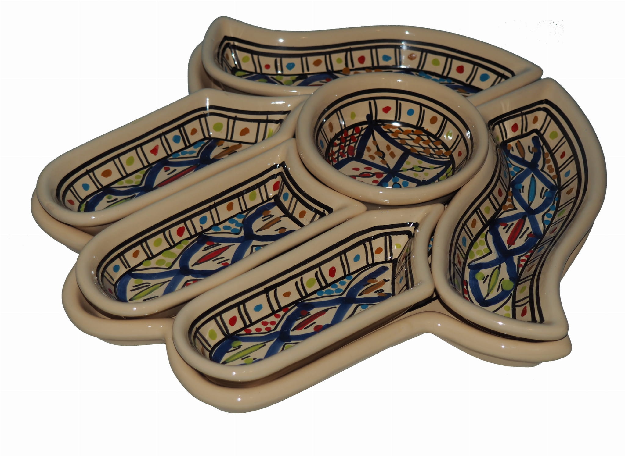 Ten ceramiczny komplet na przekąski zawiera aż 7 części: podstawkę - talerz w kształcie dłoni Fatimy o wymiarach, 5 miseczek, okrągłą miseczkę.