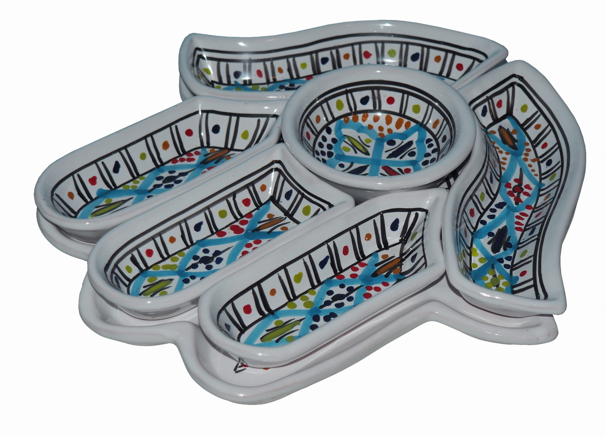 Ten ceramiczny komplet na przekąski zawiera aż 7 części: podstawkę - talerz w kształcie dłoni Fatimy o wymiarach, 5 miseczek, okrągłą miseczkę.