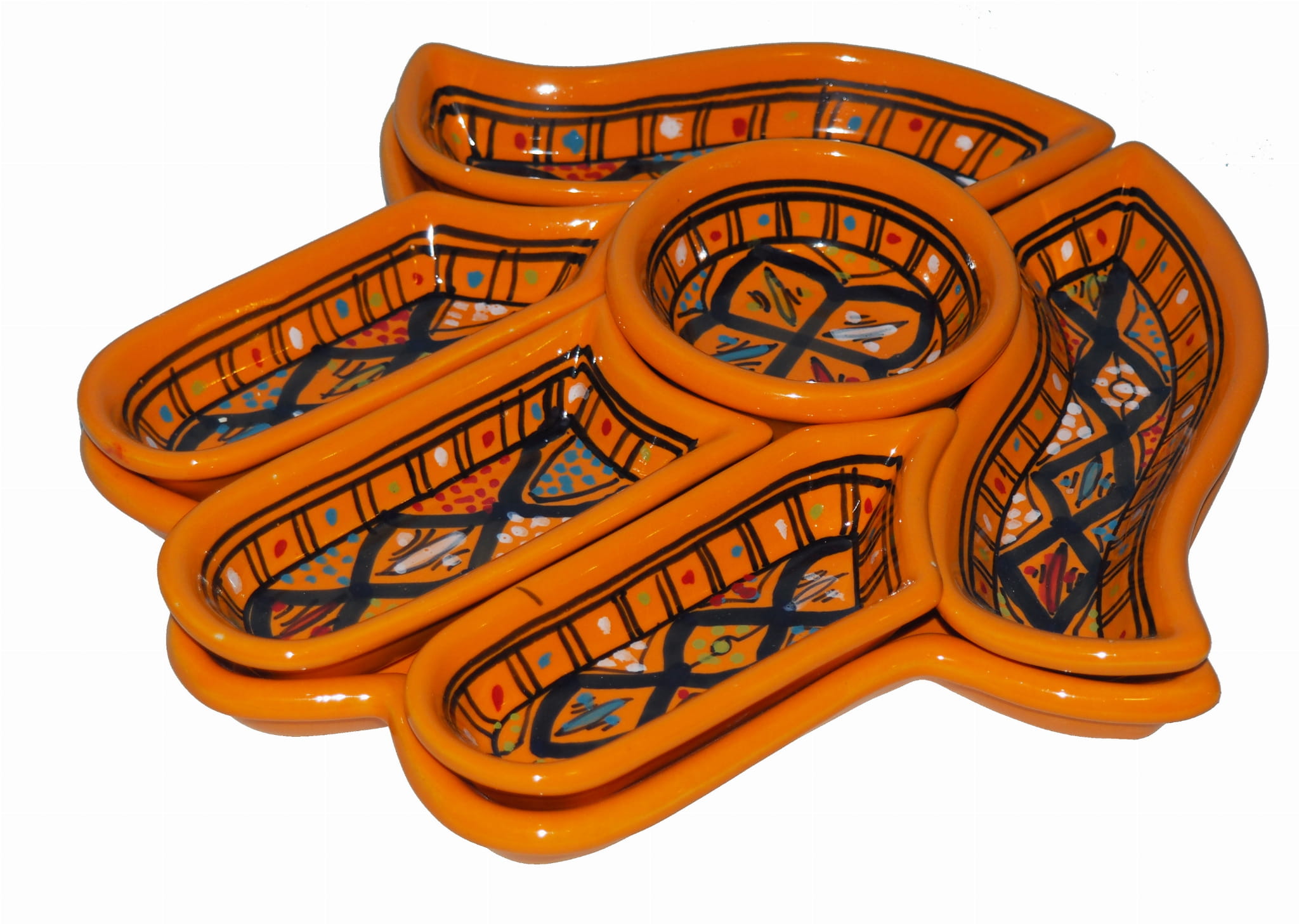 Ten ceramiczny komplet na przekąski zawiera aż 7 części: podstawkę - talerz w kształcie dłoni Fatimy o wymiarach, 5 miseczek, okrągłą miseczkę.