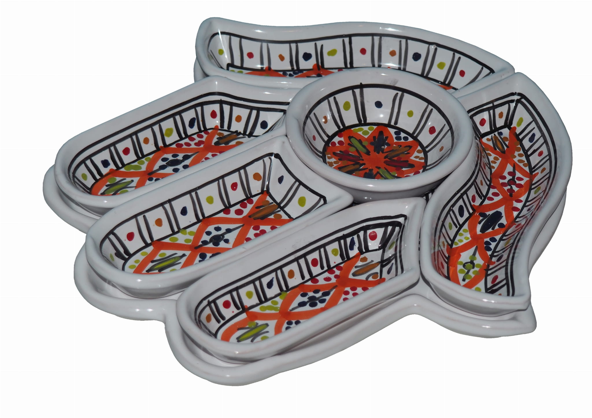 Ten ceramiczny komplet na przekąski zawiera aż 7 części: podstawkę - talerz w kształcie dłoni Fatimy o wymiarach, 5 miseczek, okrągłą miseczkę.