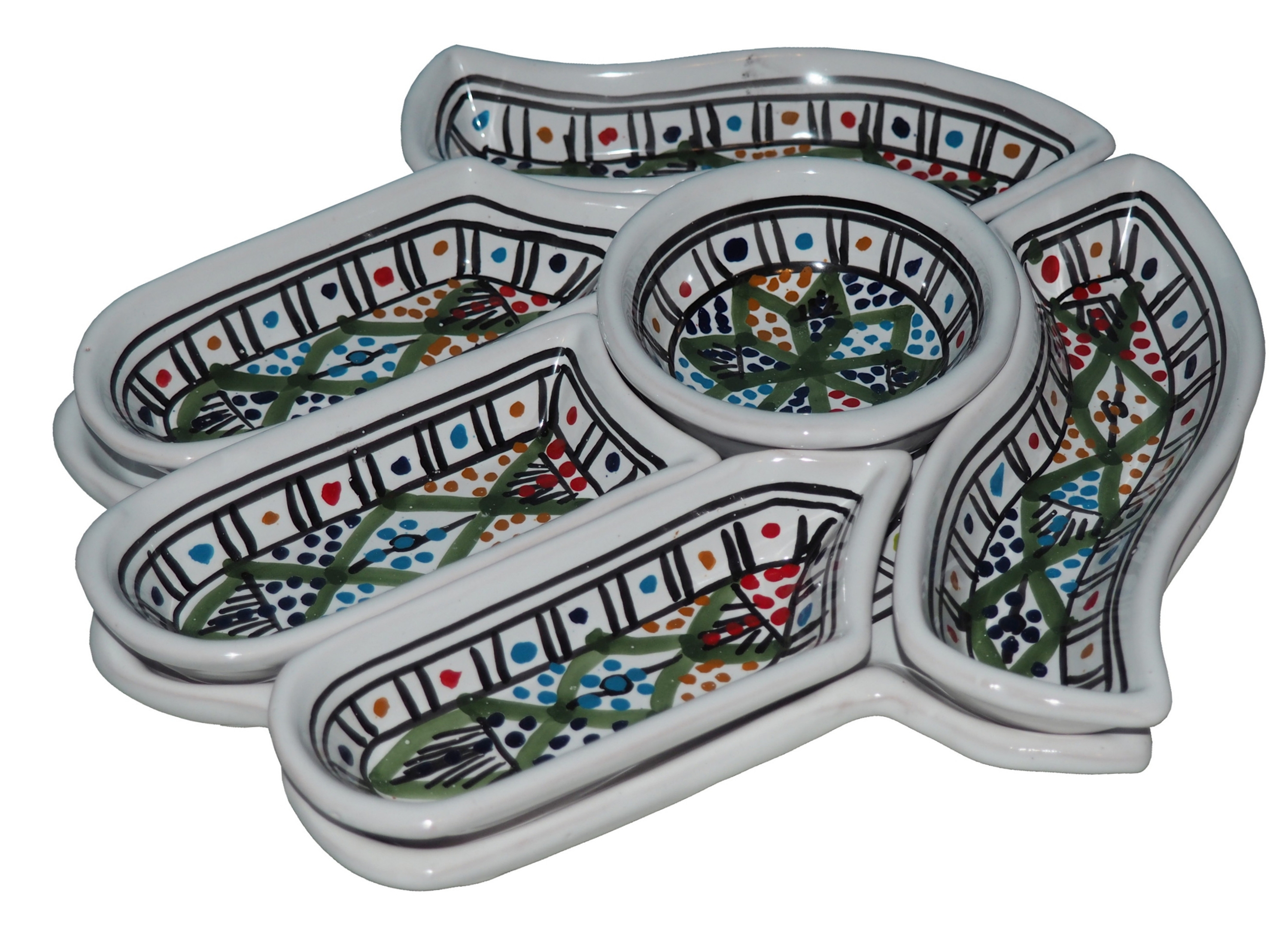 Ten ceramiczny komplet na przekąski zawiera aż 7 części: podstawkę - talerz w kształcie dłoni Fatimy o wymiarach, 5 miseczek, okrągłą miseczkę.