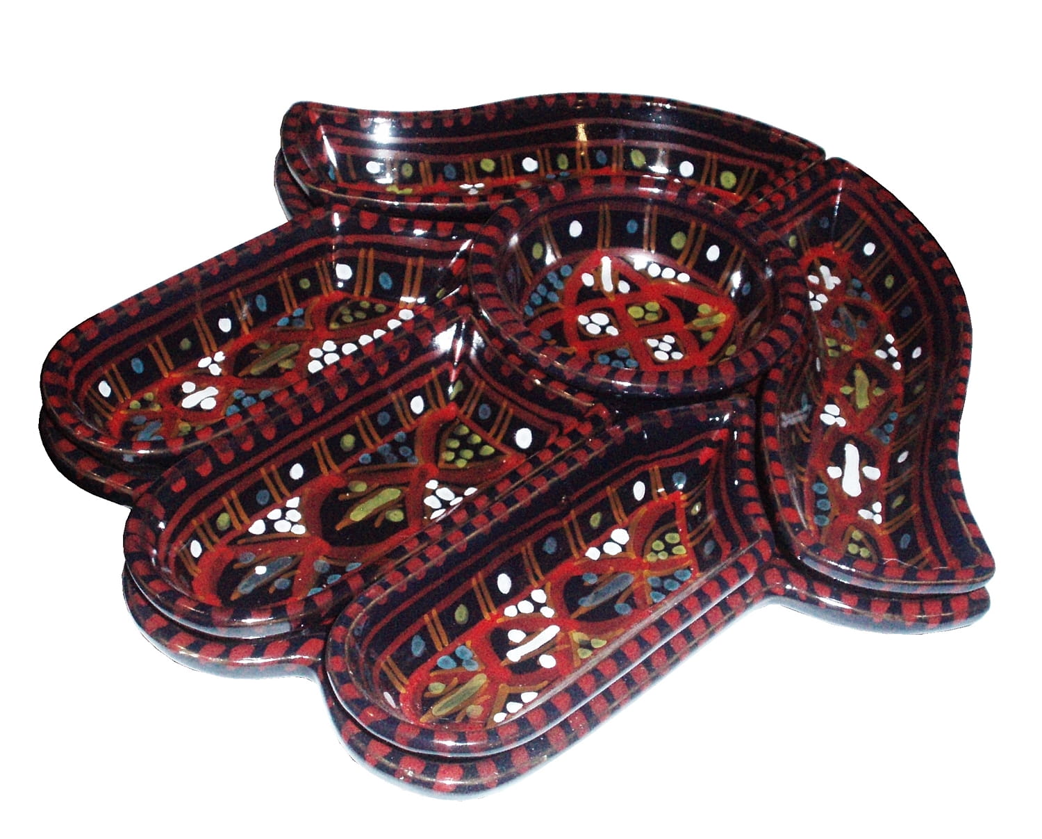 Ten ceramiczny komplet na przekąski zawiera aż 7 części: podstawkę - talerz w kształcie dłoni Fatimy o wymiarach, 5 miseczek, okrągłą miseczkę.