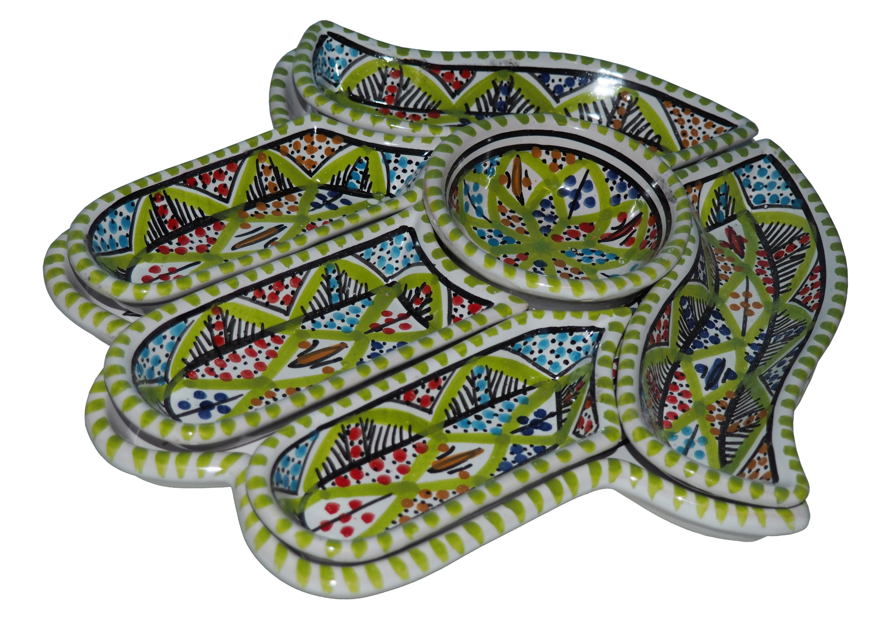 Ten ceramiczny komplet na przekąski zawiera aż 7 części: podstawkę - talerz w kształcie dłoni Fatimy o wymiarach, 5 miseczek, okrągłą miseczkę.