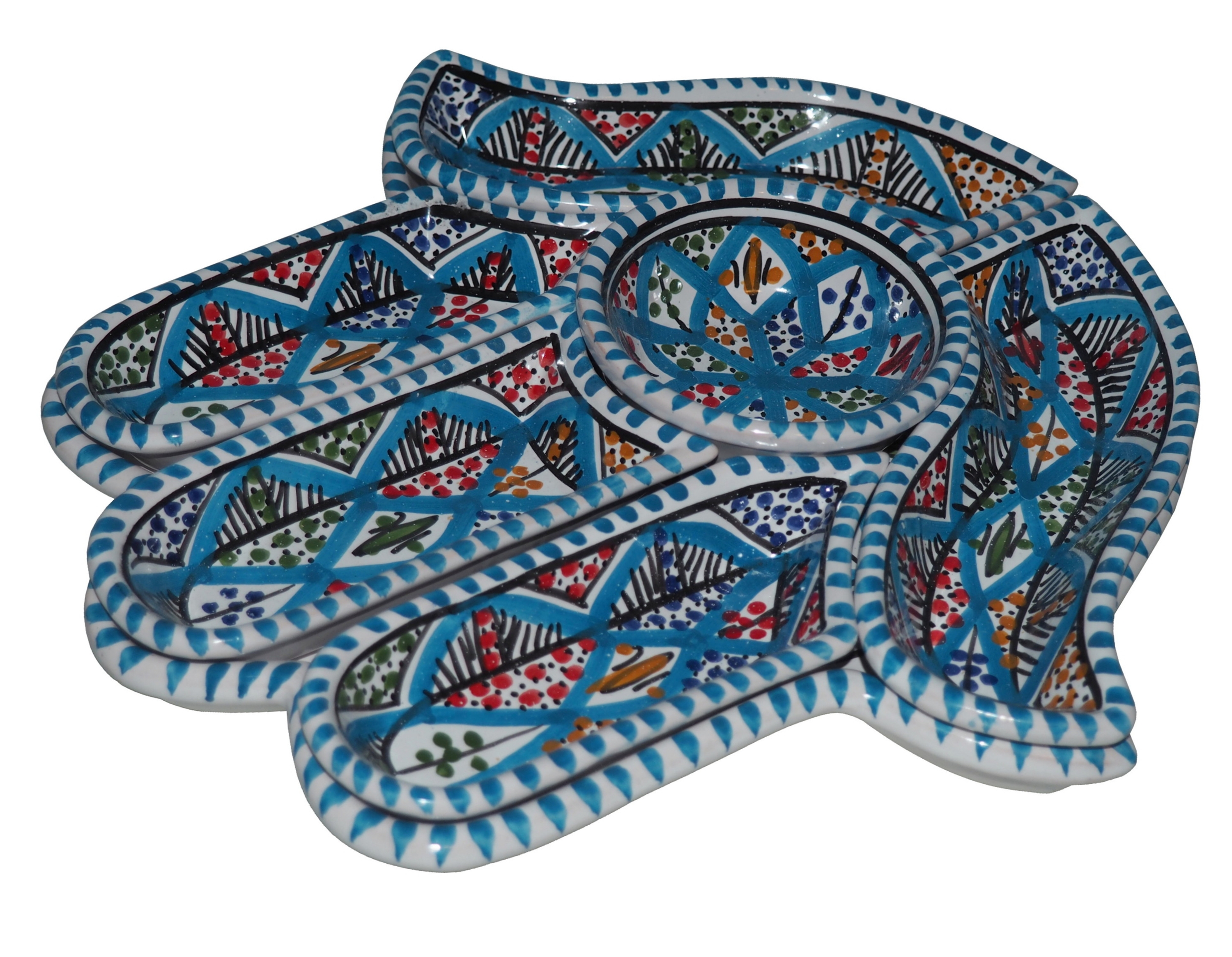 Ten ceramiczny komplet na przekąski zawiera aż 7 części: podstawkę - talerz w kształcie dłoni Fatimy o wymiarach, 5 miseczek, okrągłą miseczkę.