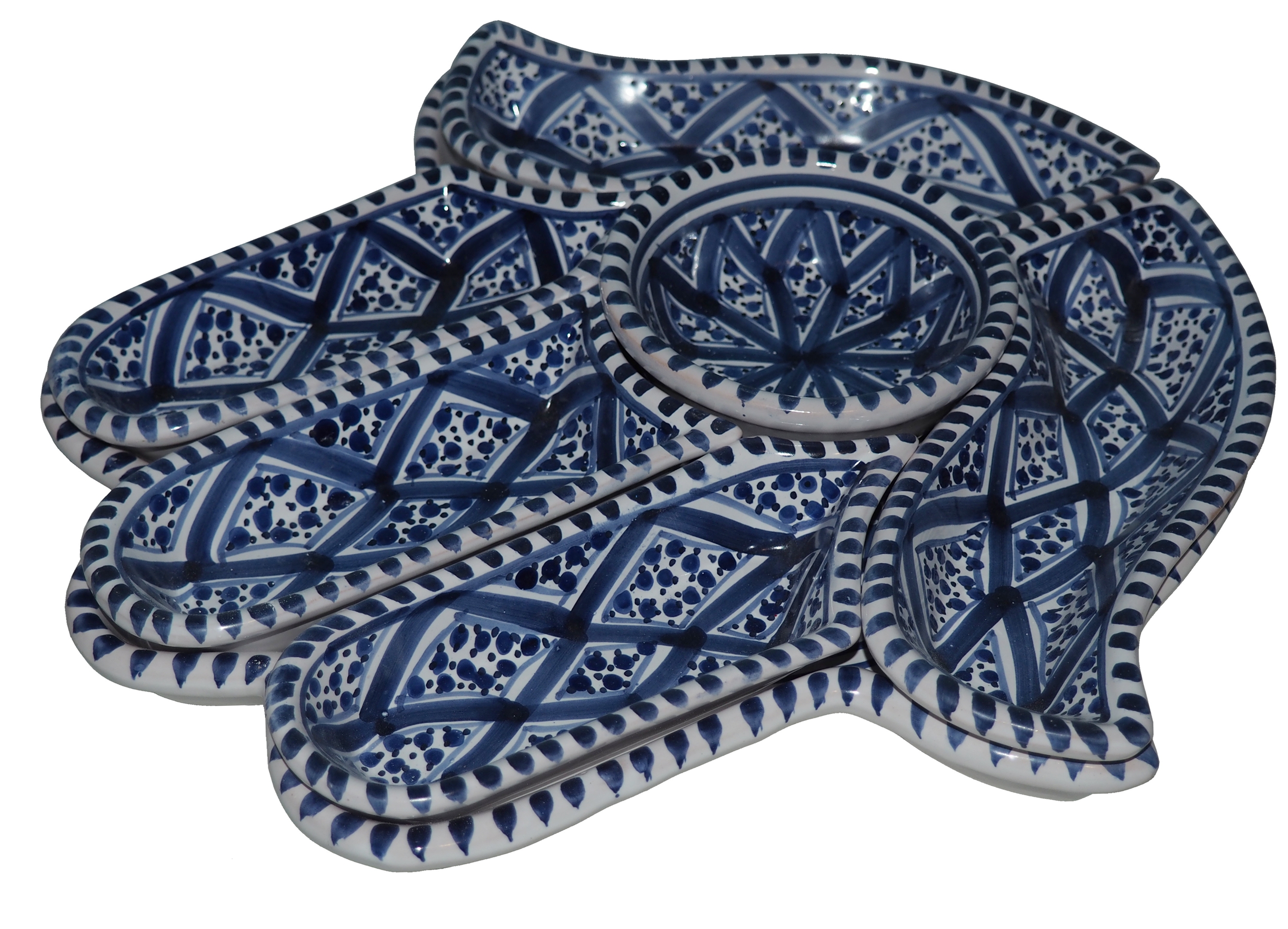 Ten ceramiczny komplet na przekąski zawiera aż 7 części: podstawkę - talerz w kształcie dłoni Fatimy o wymiarach, 5 miseczek, okrągłą miseczkę.