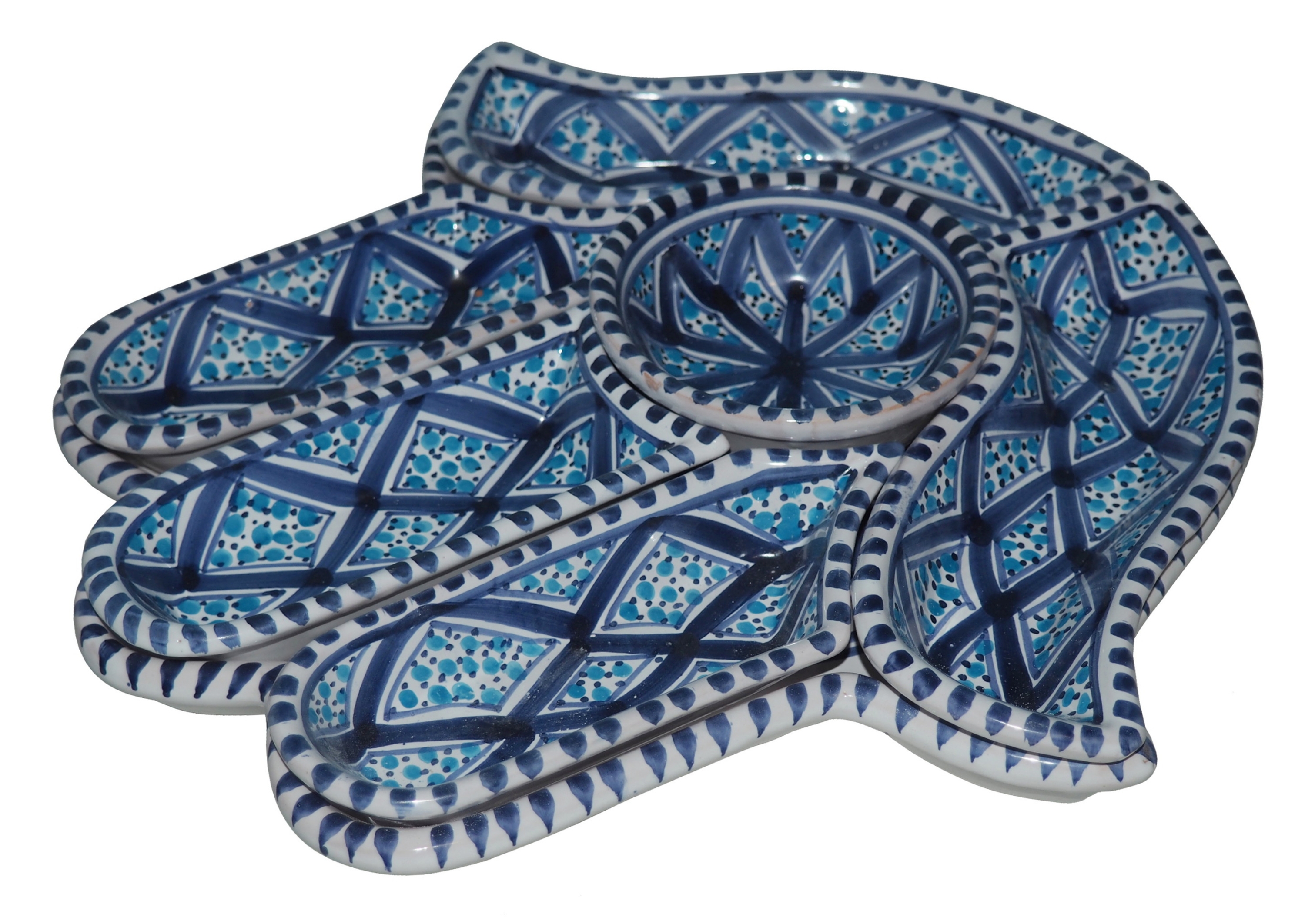 Ten ceramiczny komplet na przekąski zawiera aż 7 części: podstawkę - talerz w kształcie dłoni Fatimy o wymiarach, 5 miseczek, okrągłą miseczkę.