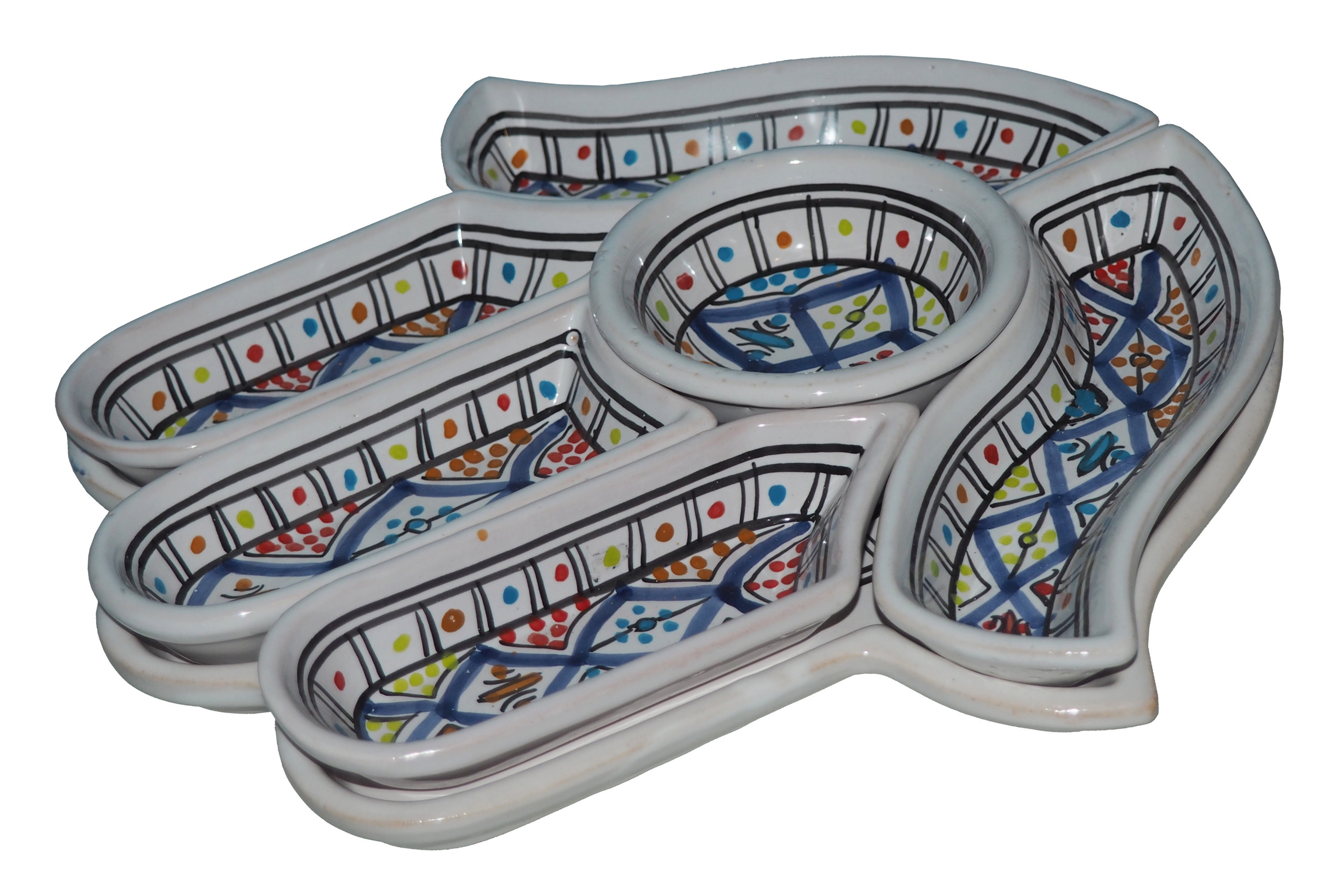 Ten ceramiczny komplet na przekąski zawiera aż 7 części: podstawkę - talerz w kształcie dłoni Fatimy o wymiarach, 5 miseczek, okrągłą miseczkę.