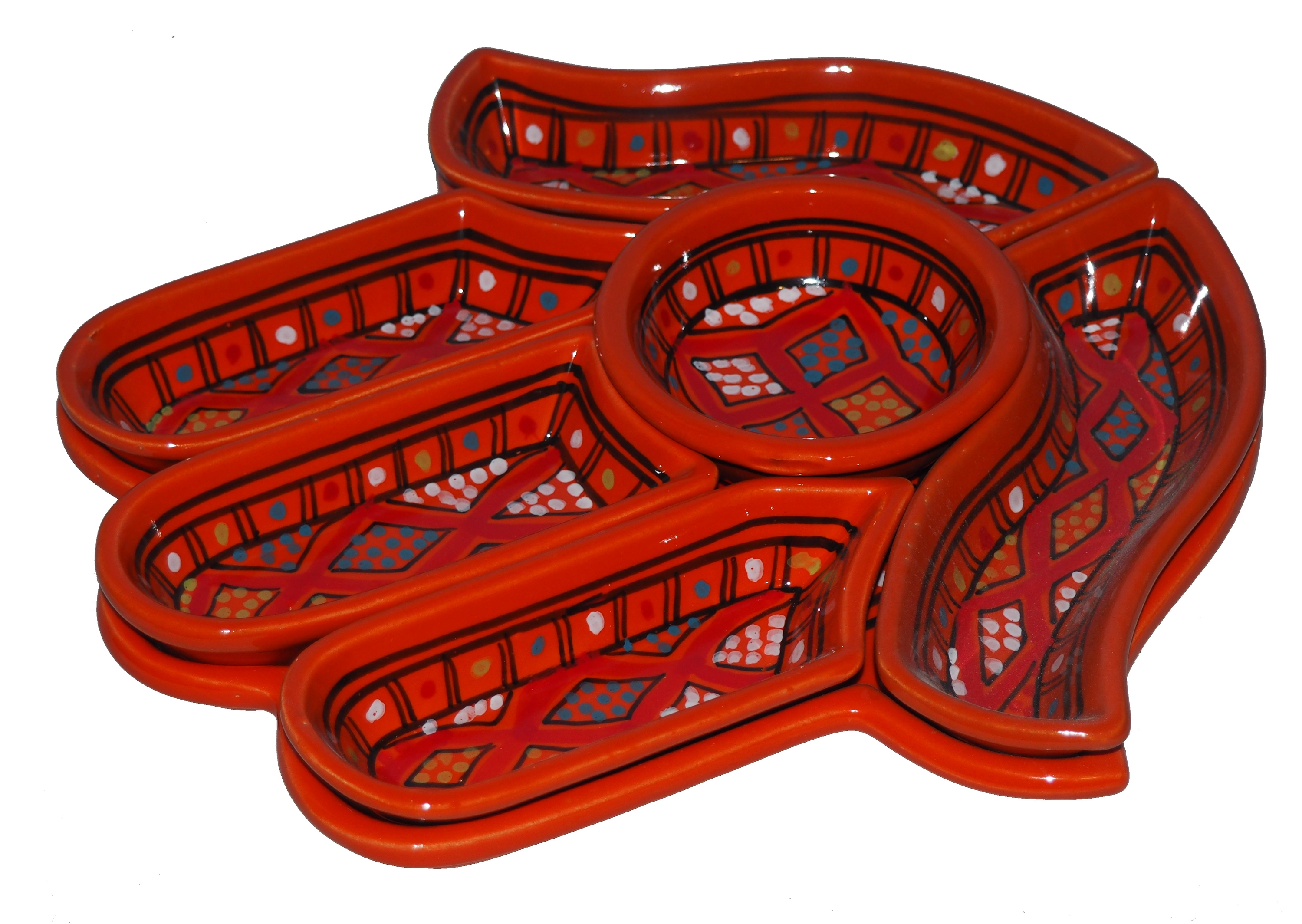 Ten ceramiczny komplet na przekąski zawiera aż 7 części: podstawkę - talerz w kształcie dłoni Fatimy o wymiarach, 5 miseczek, okrągłą miseczkę.