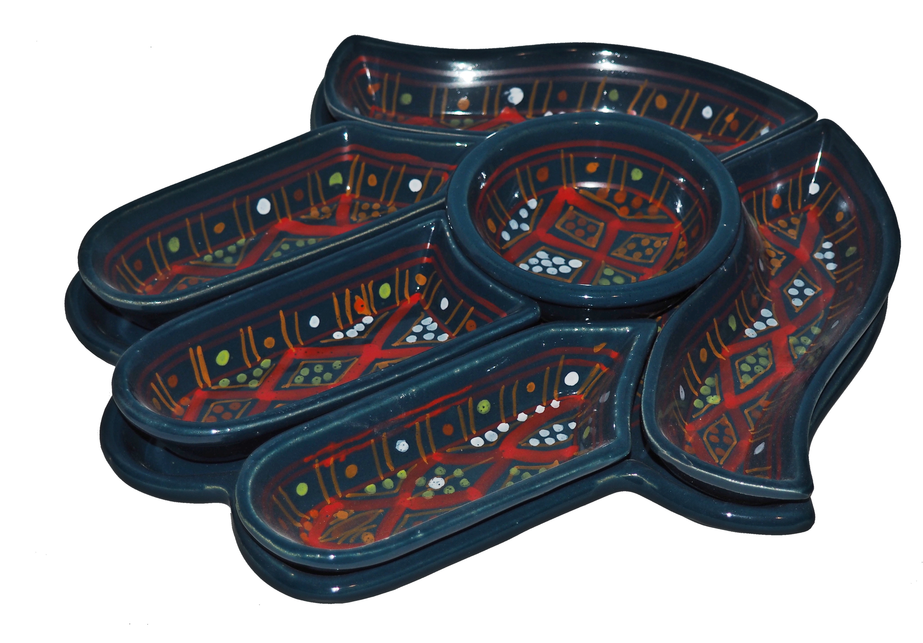 Ten ceramiczny komplet na przekąski zawiera aż 7 części: podstawkę - talerz w kształcie dłoni Fatimy o wymiarach, 5 miseczek, okrągłą miseczkę.