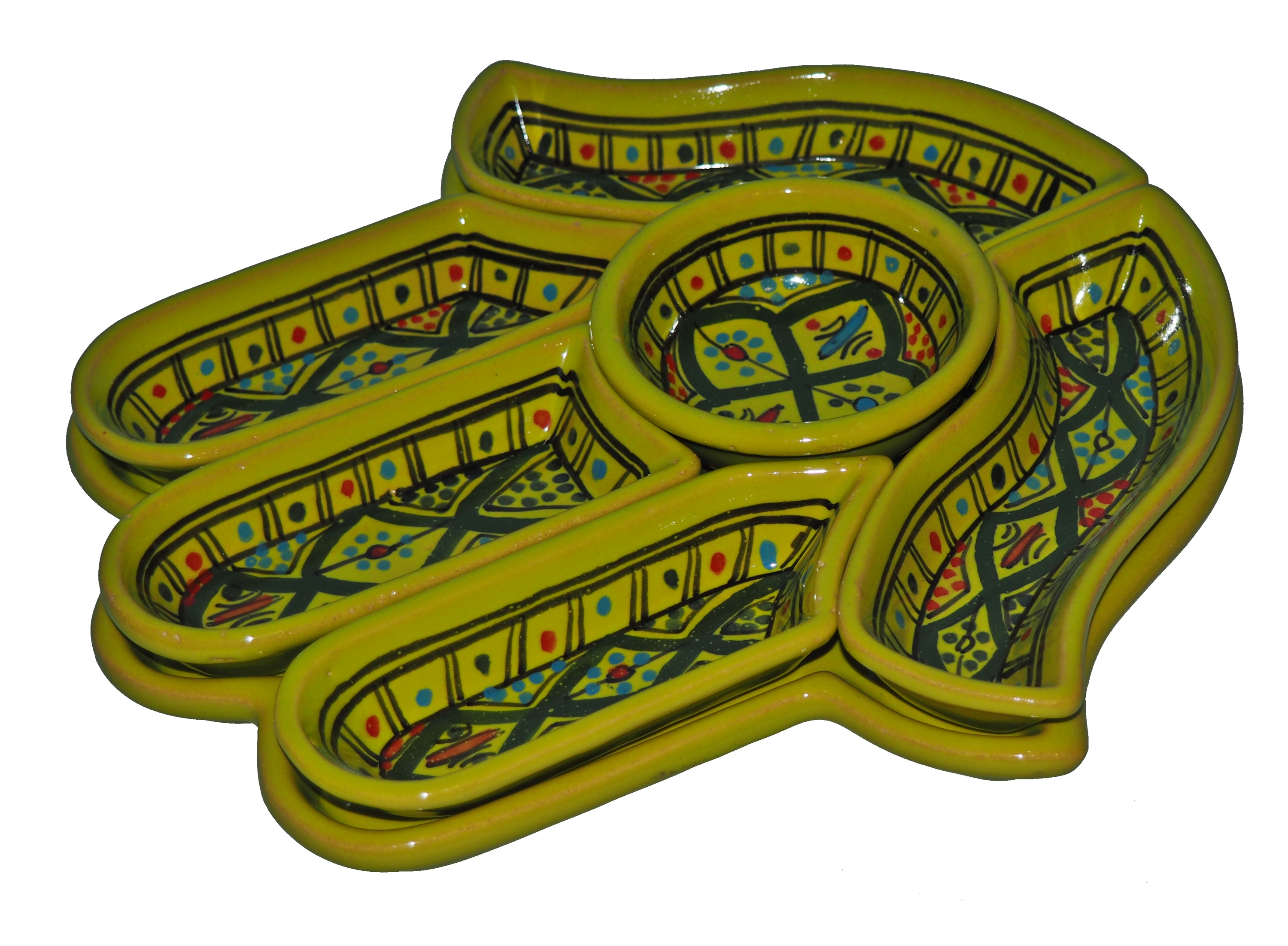 Ten ceramiczny komplet na przekąski zawiera aż 7 części: podstawkę - talerz w kształcie dłoni Fatimy o wymiarach, 5 miseczek, okrągłą miseczkę.