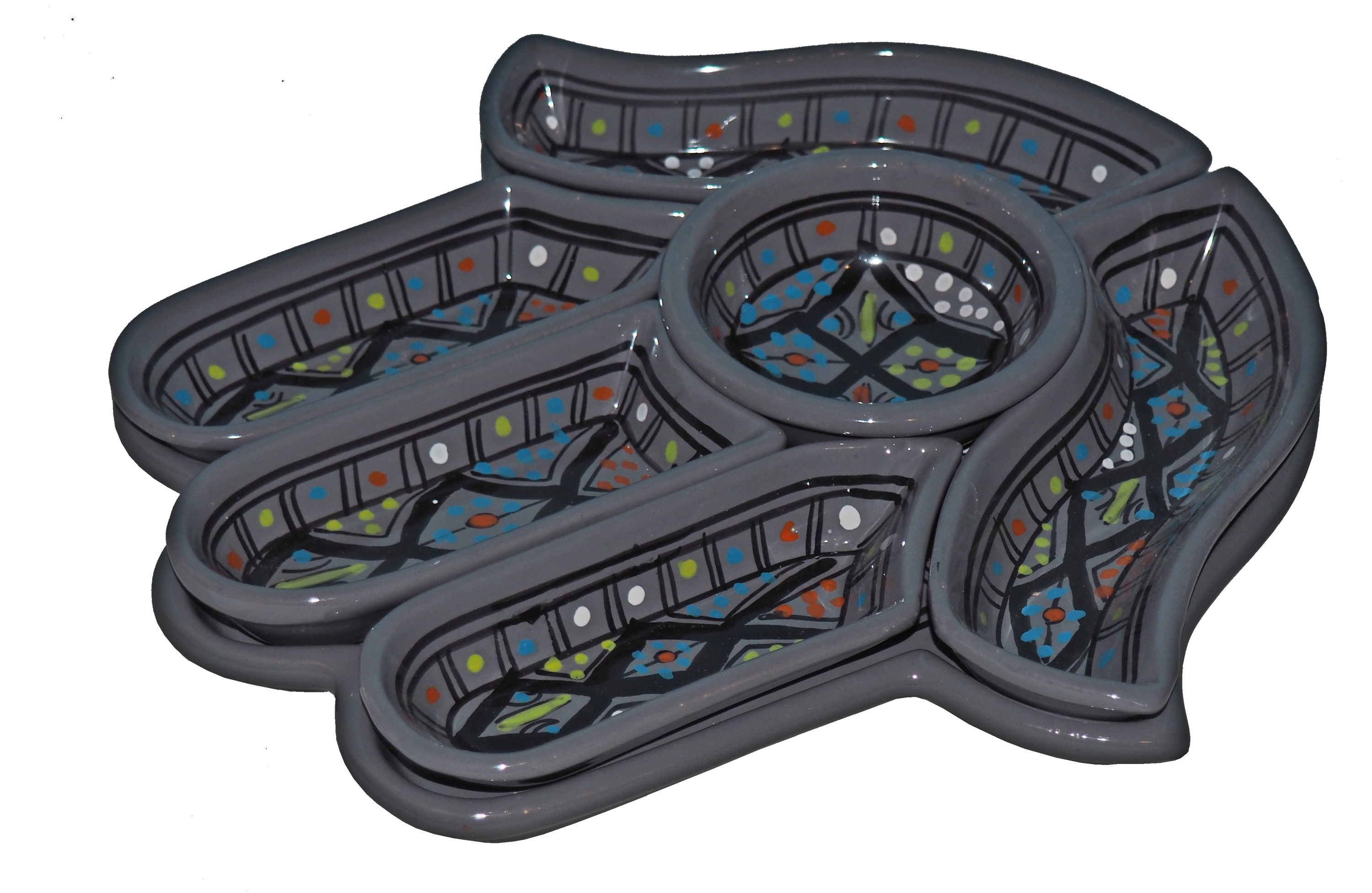 Ten ceramiczny komplet na przekąski zawiera aż 7 części: podstawkę - talerz w kształcie dłoni Fatimy o wymiarach, 5 miseczek, okrągłą miseczkę.