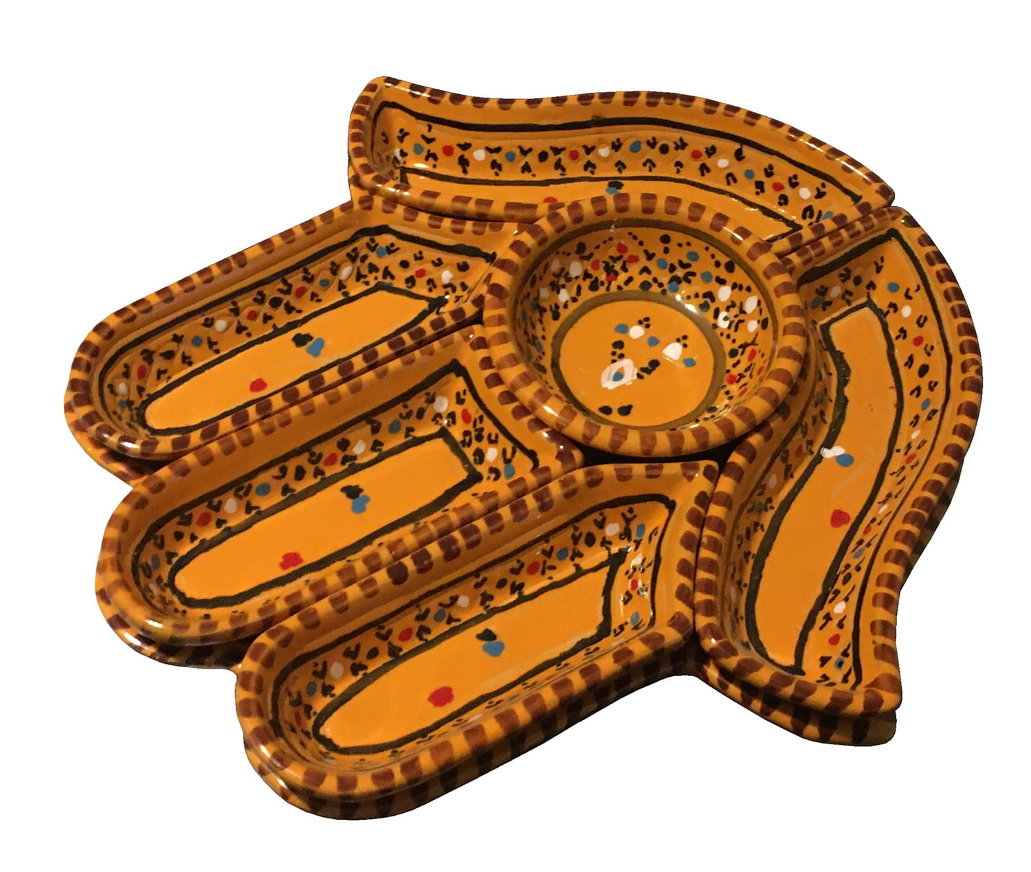 Ten ceramiczny komplet na przekąski zawiera aż 7 części: podstawkę - talerz w kształcie dłoni Fatimy o wymiarach, 5 miseczek, okrągłą miseczkę.