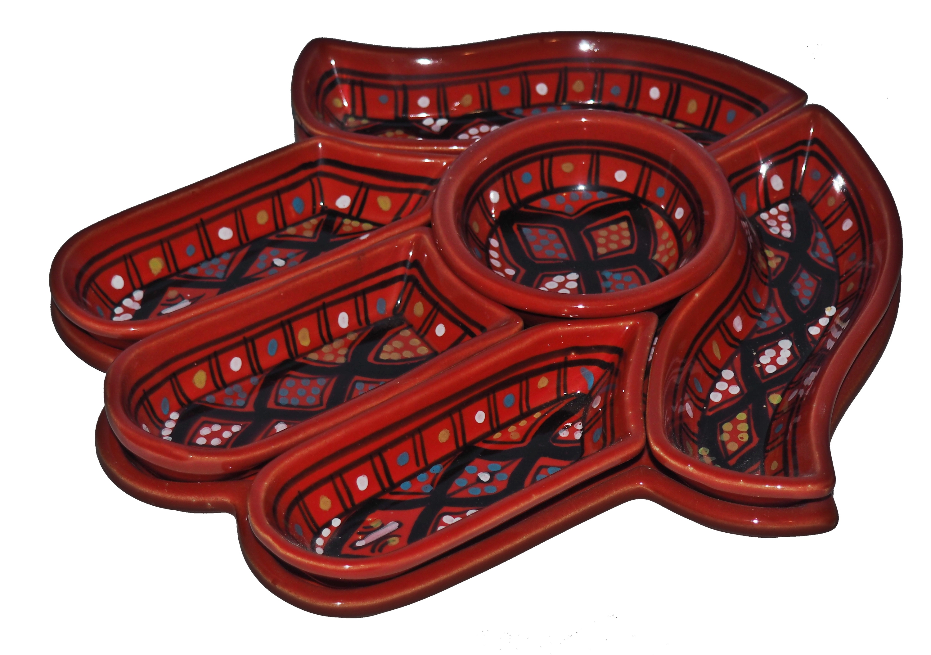 Ten ceramiczny komplet na przekąski zawiera aż 7 części: podstawkę - talerz w kształcie dłoni Fatimy o wymiarach, 5 miseczek, okrągłą miseczkę.
