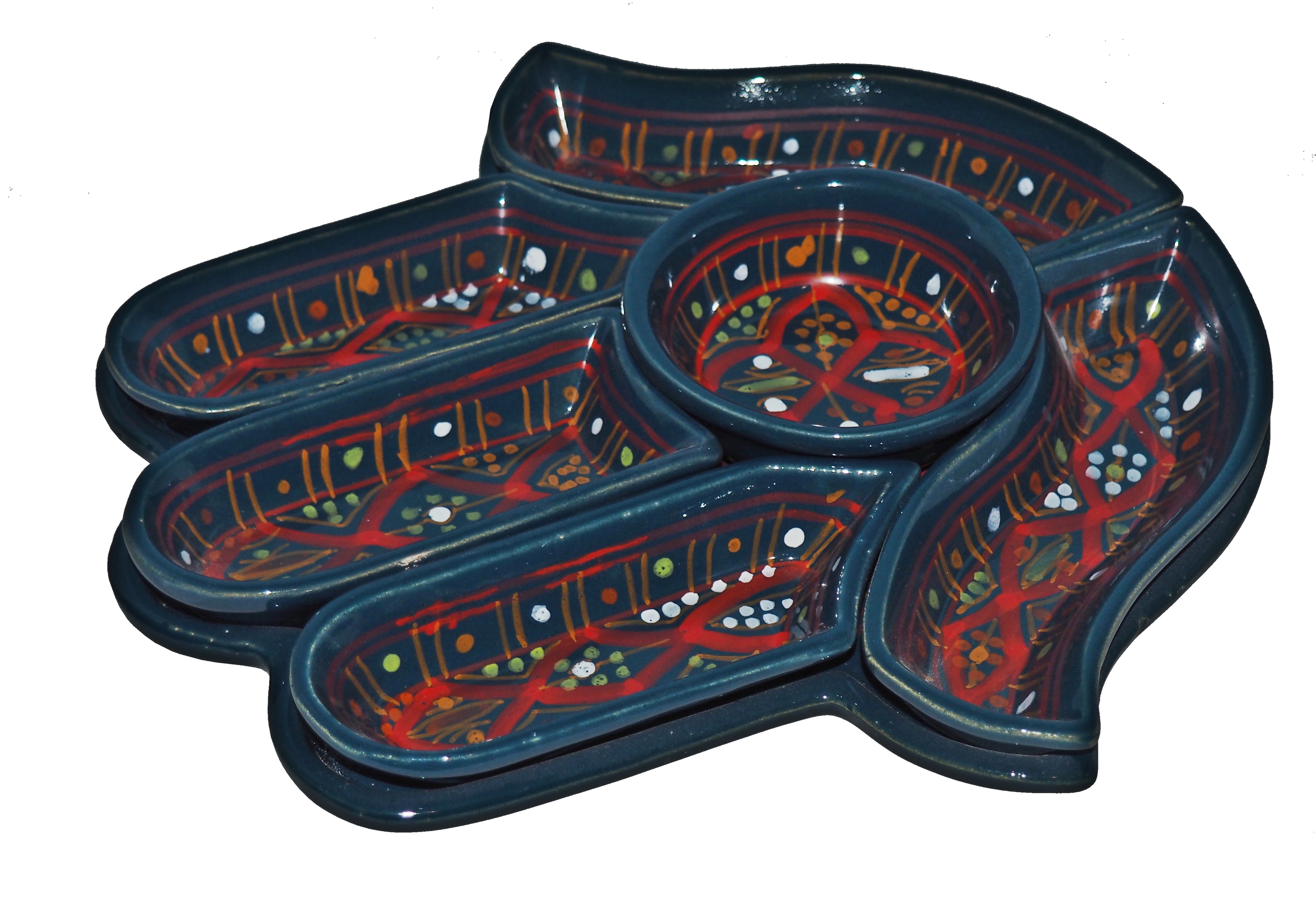 Ten ceramiczny komplet na przekąski zawiera aż 7 części: podstawkę - talerz w kształcie dłoni Fatimy o wymiarach, 5 miseczek, okrągłą miseczkę.