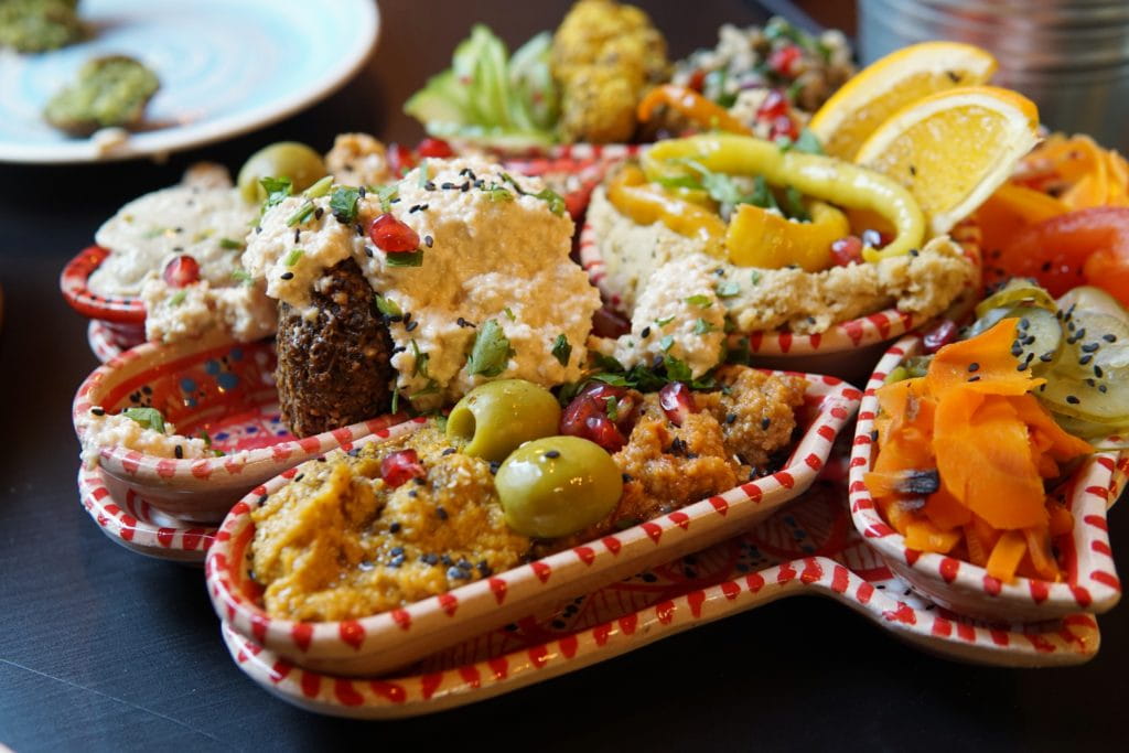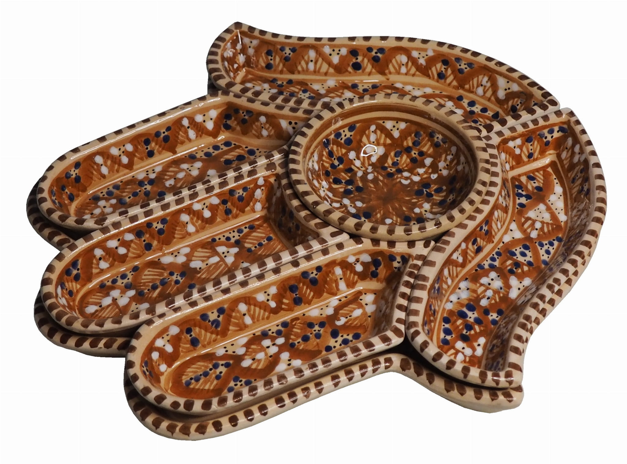 Ten ceramiczny komplet na przekąski zawiera aż 7 części: podstawkę - talerz w kształcie dłoni Fatimy o wymiarach, 5 miseczek, okrągłą miseczkę.