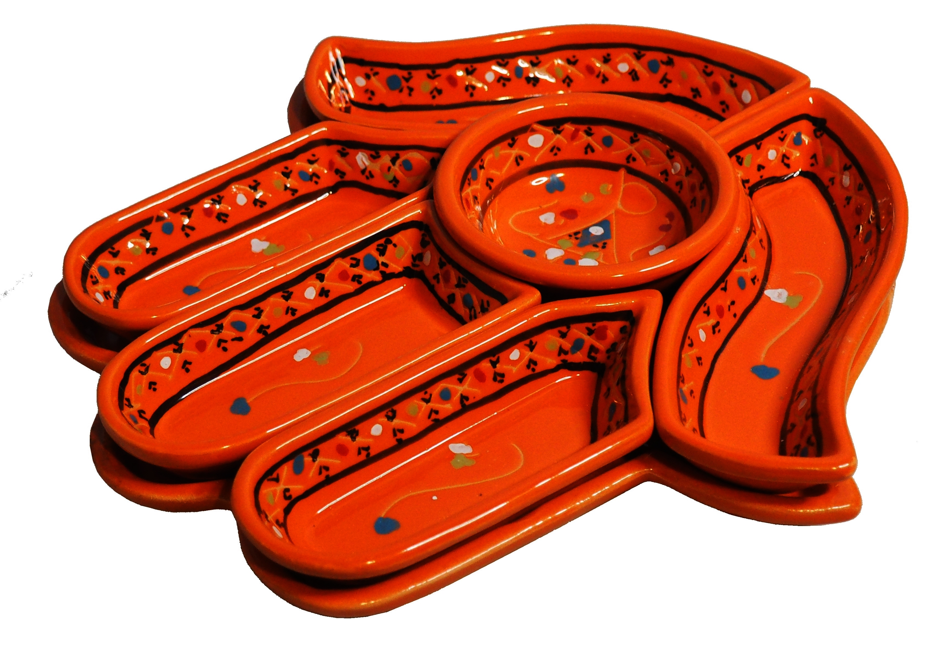 Ten ceramiczny komplet na przekąski zawiera aż 7 części: podstawkę - talerz w kształcie dłoni Fatimy o wymiarach, 5 miseczek, okrągłą miseczkę.