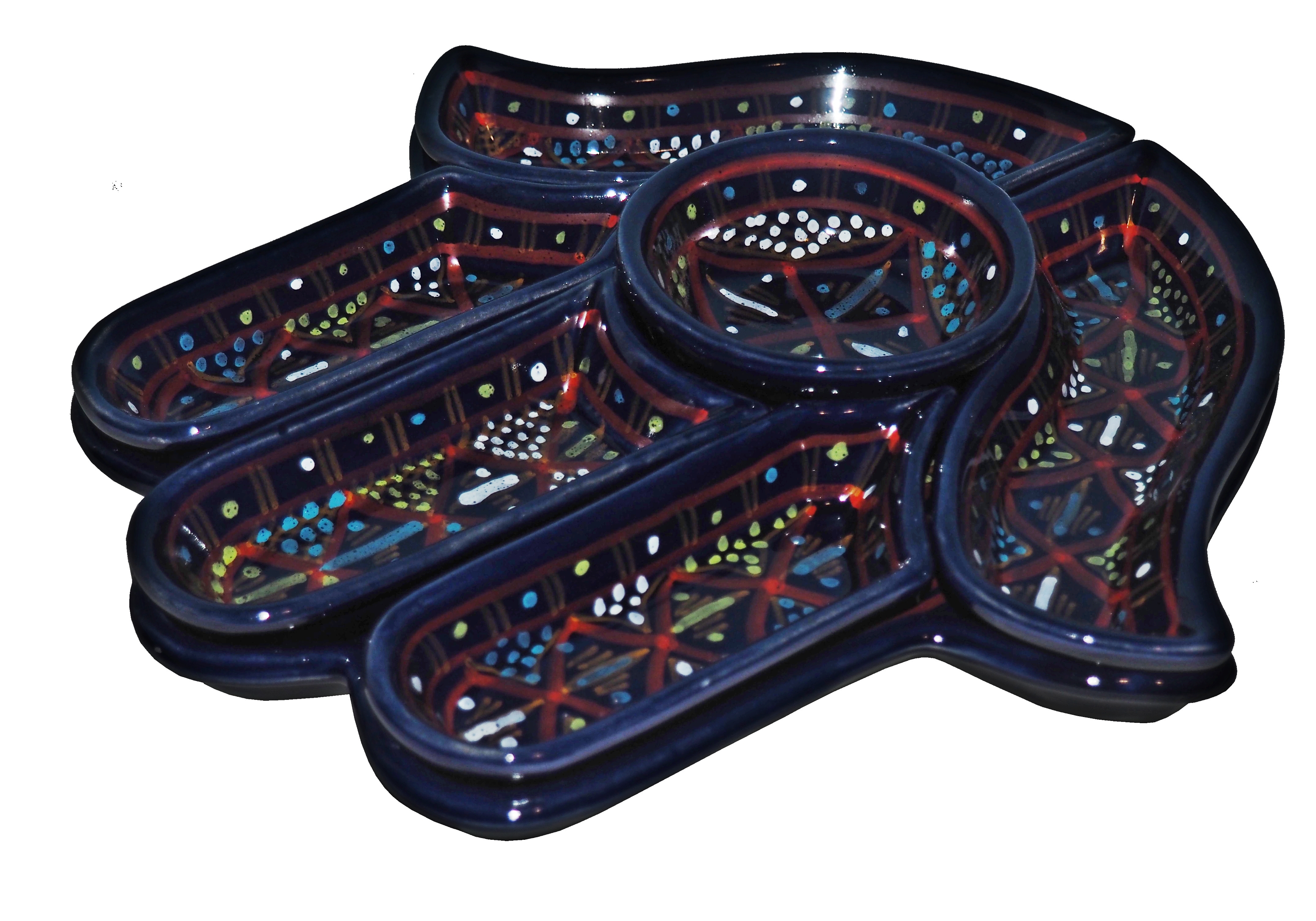 Ten ceramiczny komplet na przekąski zawiera aż 7 części: podstawkę - talerz w kształcie dłoni Fatimy o wymiarach, 5 miseczek, okrągłą miseczkę.