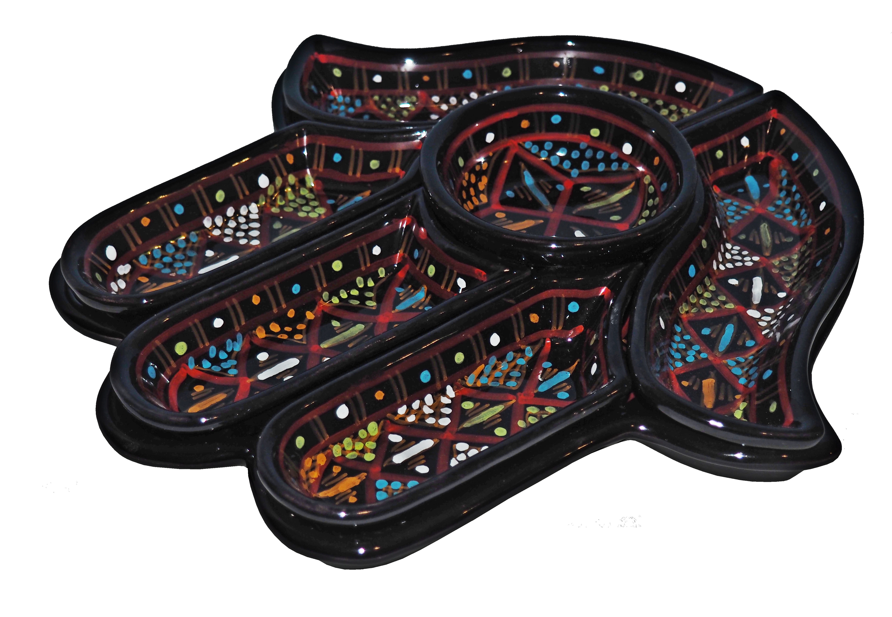 Ten ceramiczny komplet na przekąski zawiera aż 7 części: podstawkę - talerz w kształcie dłoni Fatimy o wymiarach, 5 miseczek, okrągłą miseczkę.