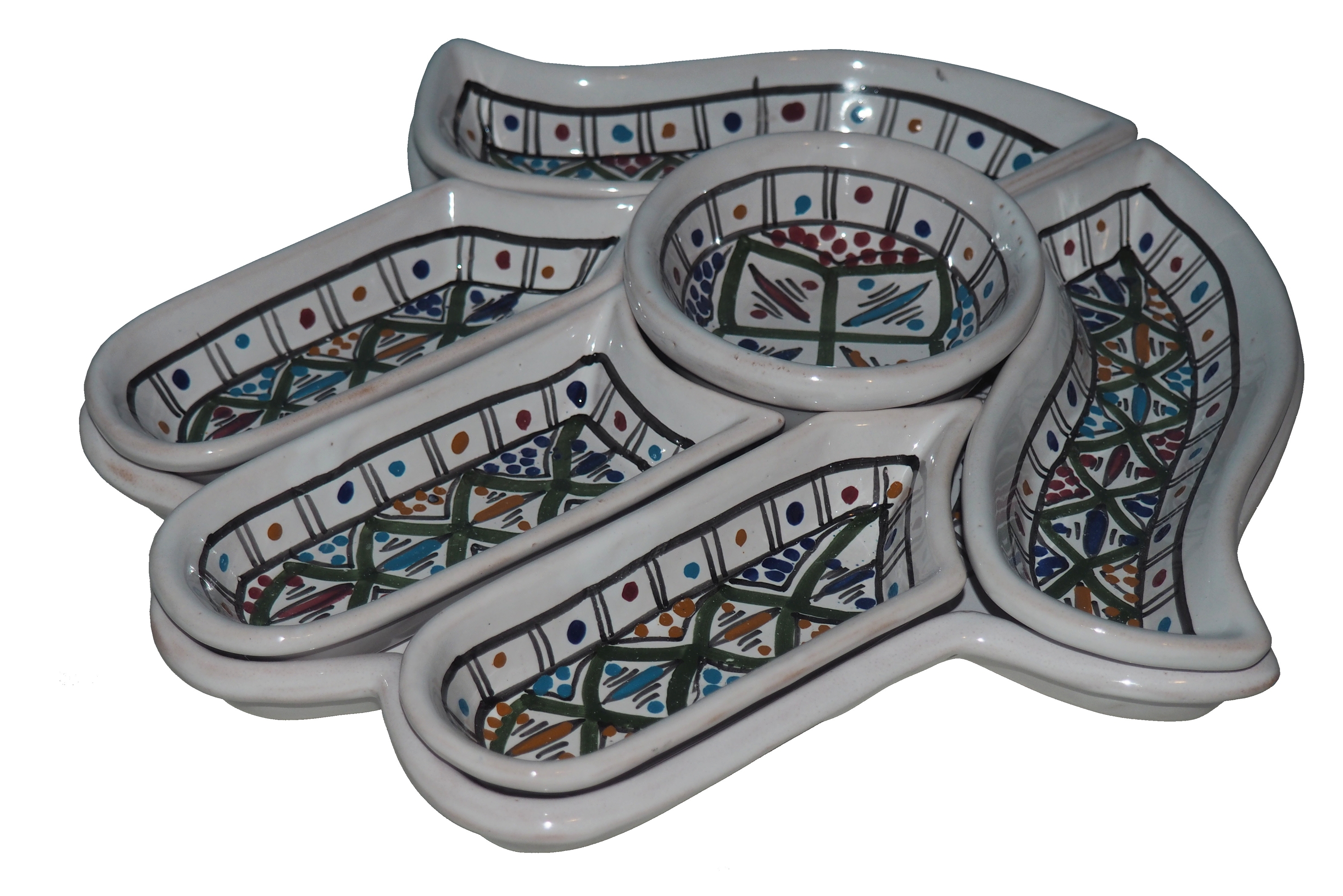 Ten ceramiczny komplet na przekąski zawiera aż 7 części: podstawkę - talerz w kształcie dłoni Fatimy o wymiarach, 5 miseczek, okrągłą miseczkę.