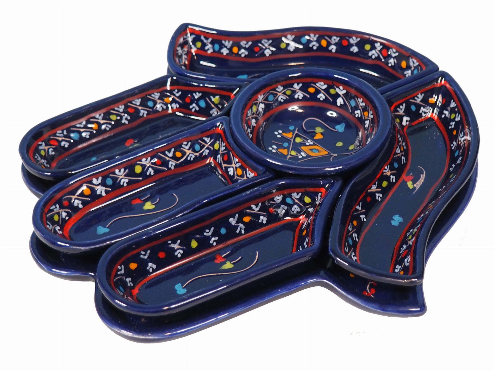 Ten ceramiczny komplet na przekąski zawiera aż 7 części: podstawkę - talerz w kształcie dłoni Fatimy o wymiarach, 5 miseczek, okrągłą miseczkę.