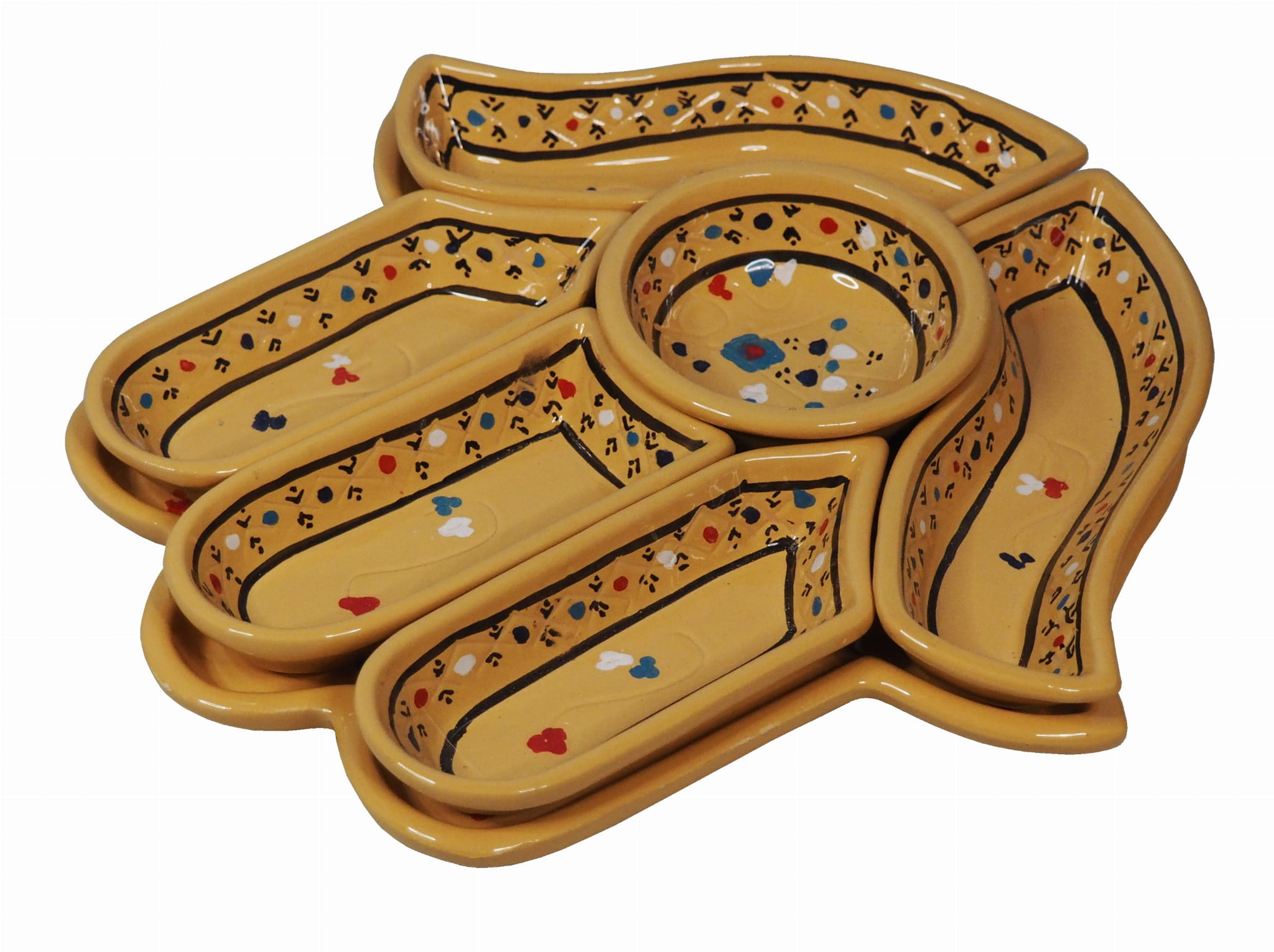 Ten ceramiczny komplet na przekąski zawiera aż 7 części: podstawkę - talerz w kształcie dłoni Fatimy o wymiarach, 5 miseczek, okrągłą miseczkę.