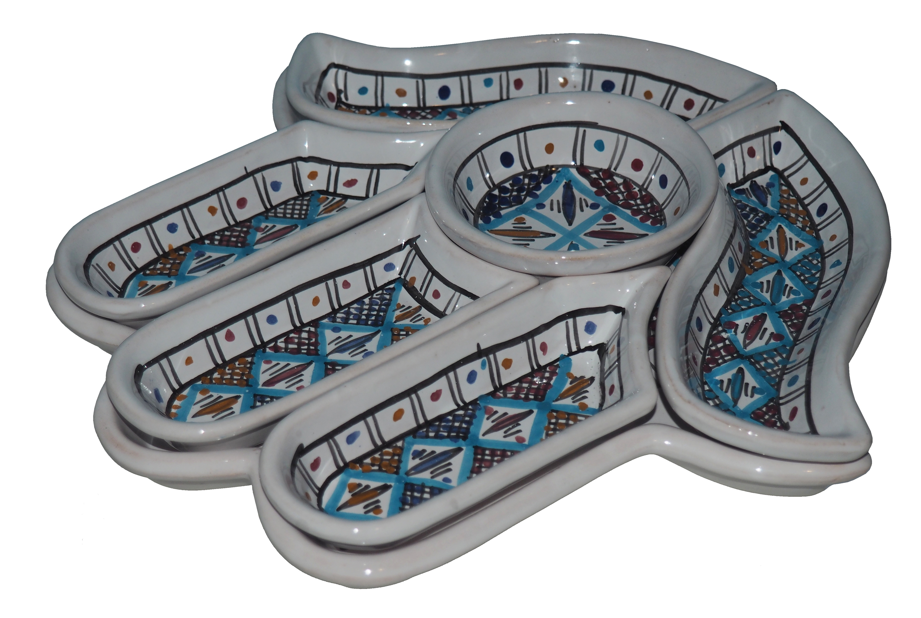 Ten ceramiczny komplet na przekąski zawiera aż 7 części: podstawkę - talerz w kształcie dłoni Fatimy o wymiarach, 5 miseczek, okrągłą miseczkę.