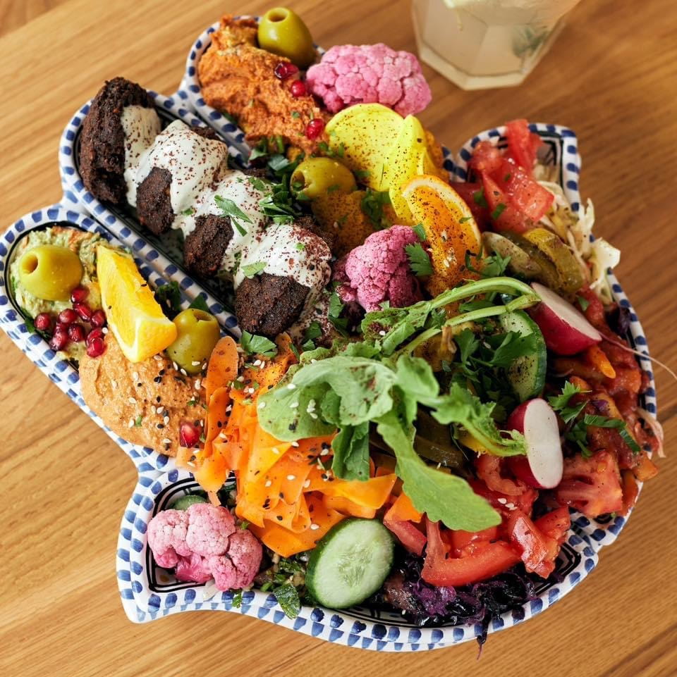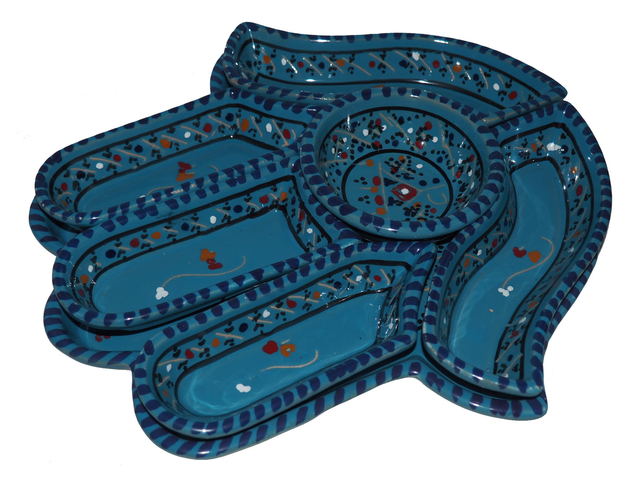 Ten ceramiczny komplet na przekąski zawiera aż 7 części: podstawkę - talerz w kształcie dłoni Fatimy o wymiarach, 5 miseczek, okrągłą miseczkę.