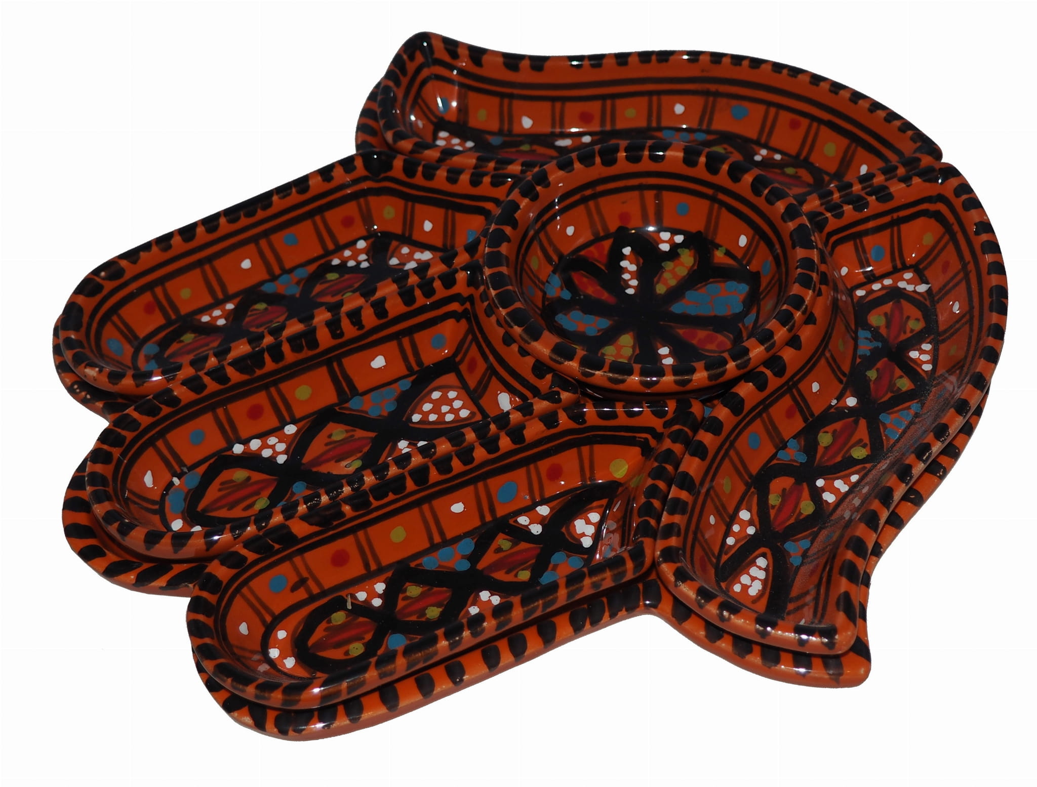 Ten ceramiczny komplet na przekąski zawiera aż 7 części: podstawkę - talerz w kształcie dłoni Fatimy o wymiarach, 5 miseczek, okrągłą miseczkę.