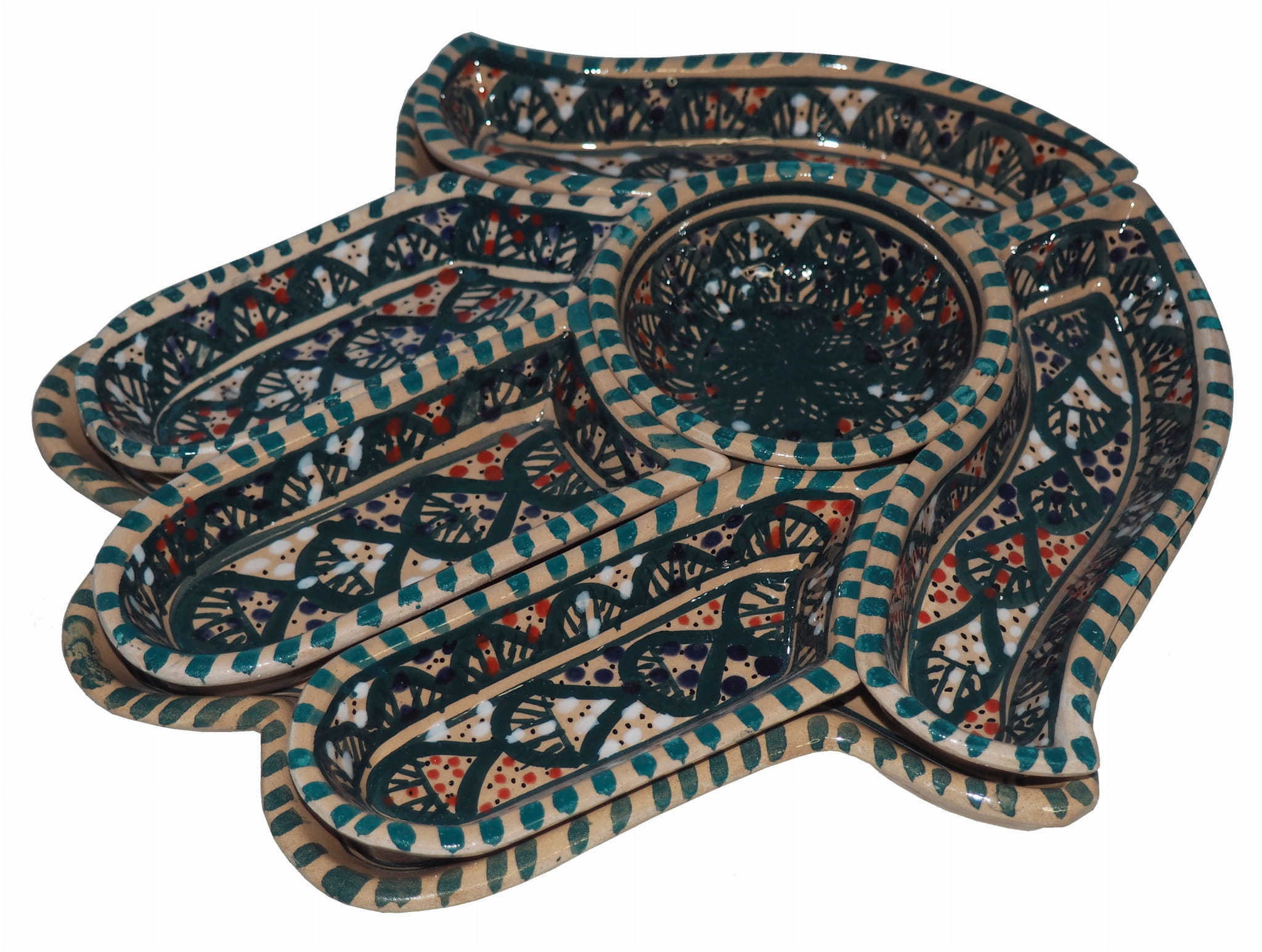 Ten ceramiczny komplet na przekąski zawiera aż 7 części: podstawkę - talerz w kształcie dłoni Fatimy o wymiarach, 5 miseczek, okrągłą miseczkę.