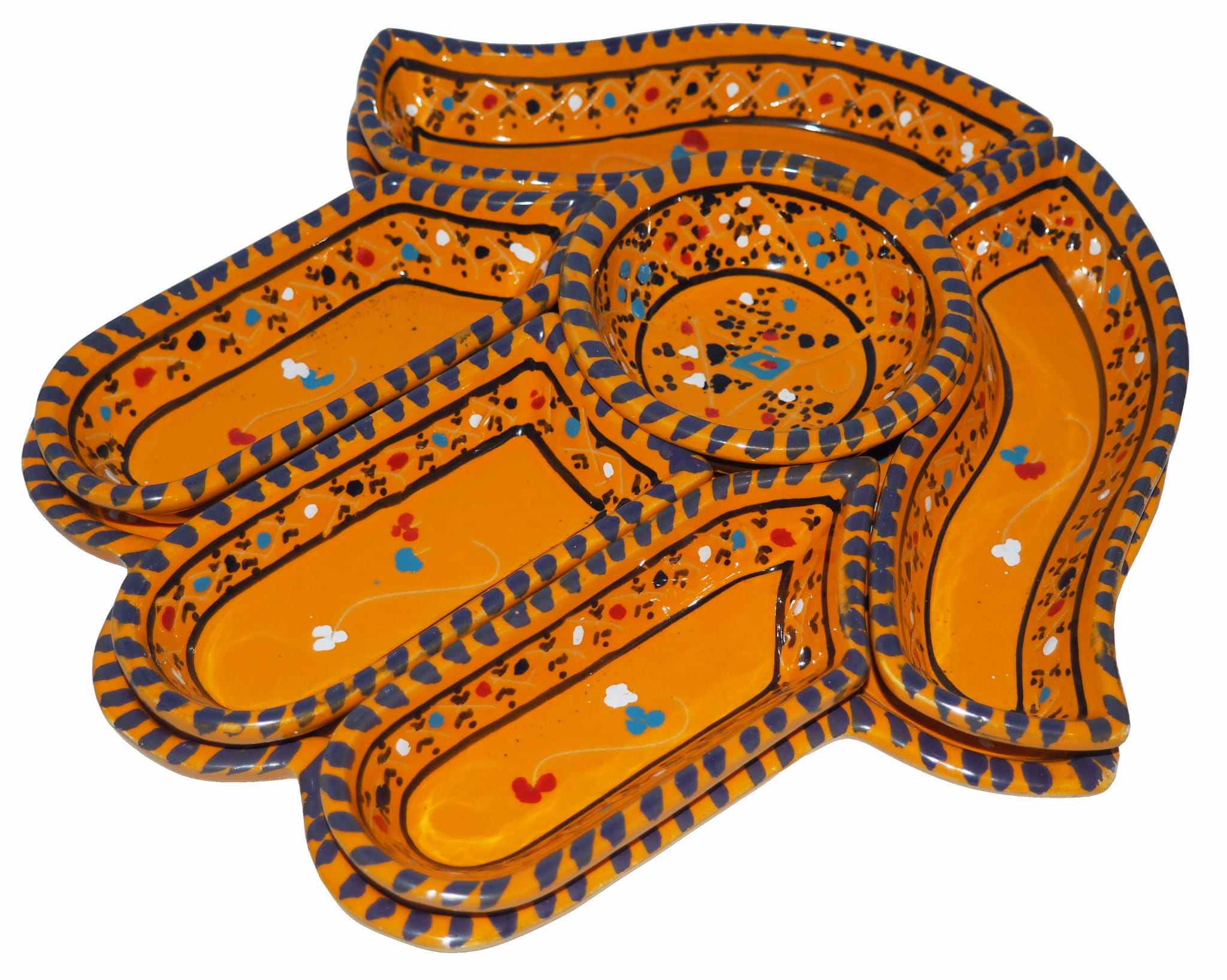 Ten ceramiczny komplet na przekąski zawiera aż 7 części: podstawkę - talerz w kształcie dłoni Fatimy o wymiarach, 5 miseczek, okrągłą miseczkę.