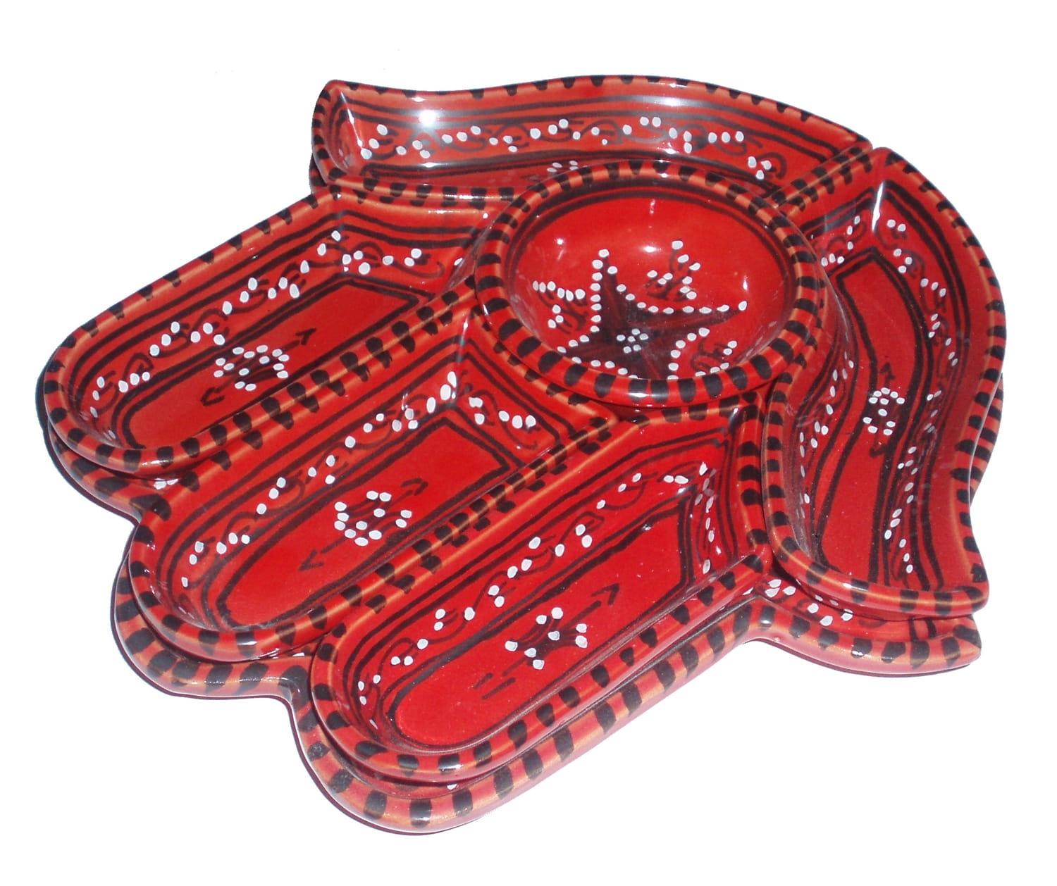 Ten ceramiczny komplet na przekąski zawiera aż 7 części: podstawkę - talerz w kształcie dłoni Fatimy o wymiarach, 5 miseczek, okrągłą miseczkę.