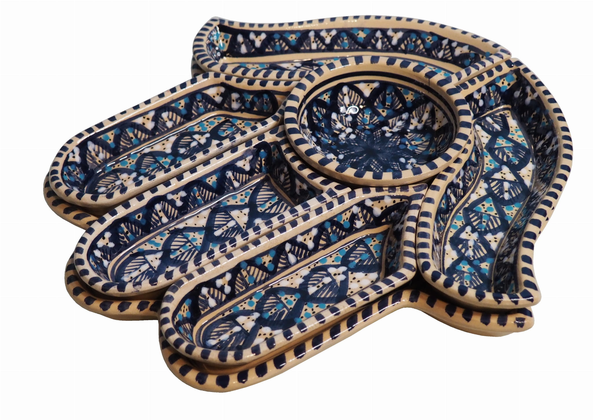 Ten ceramiczny komplet na przekąski zawiera aż 7 części: podstawkę - talerz w kształcie dłoni Fatimy o wymiarach, 5 miseczek, okrągłą miseczkę.