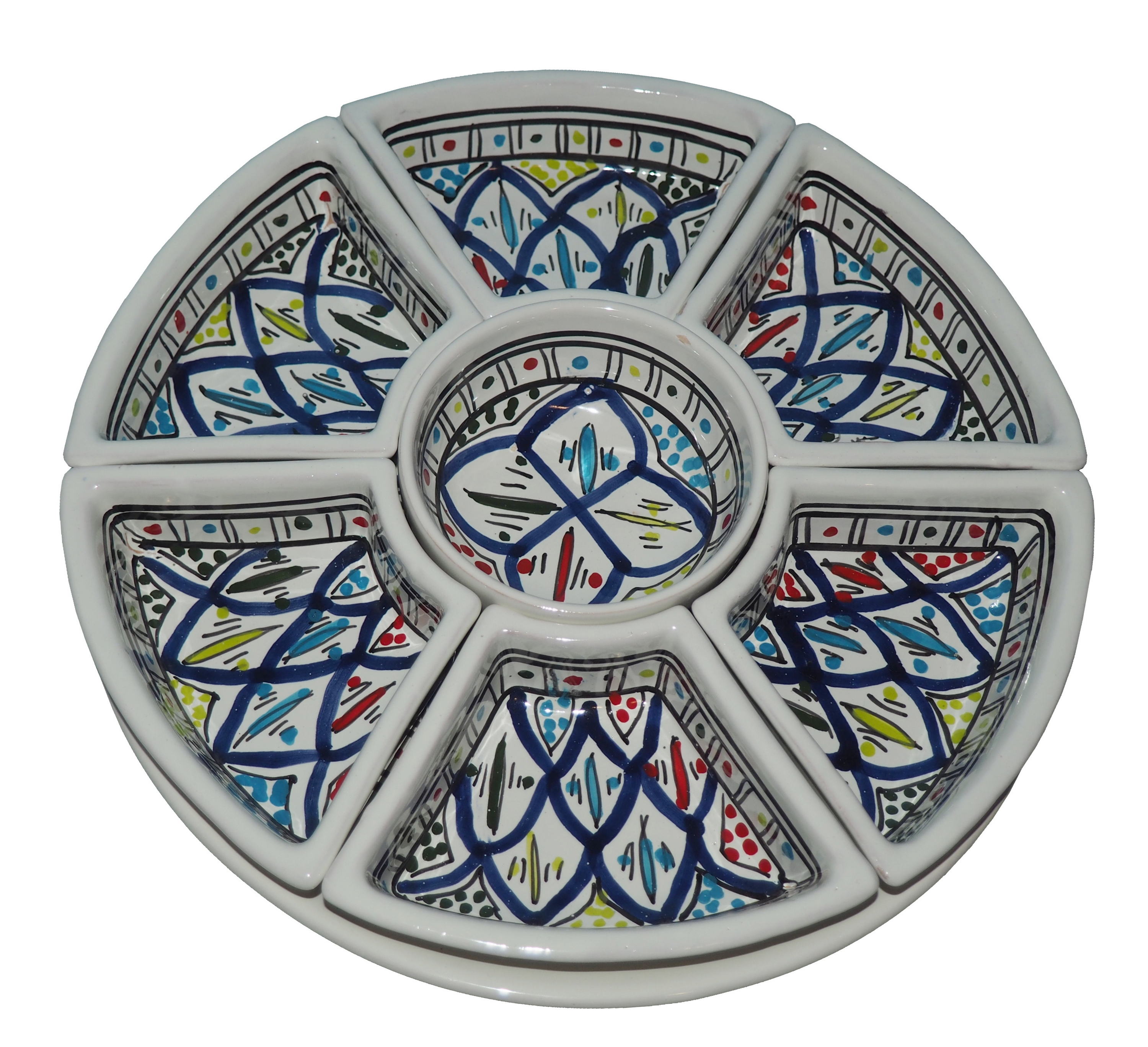 Arabski, ręcznie wykonany i ręcznie malowany zestaw na przystawki, przekąski, dodatki. Może także stanowić talerz dla wieloskładnikowego dania.