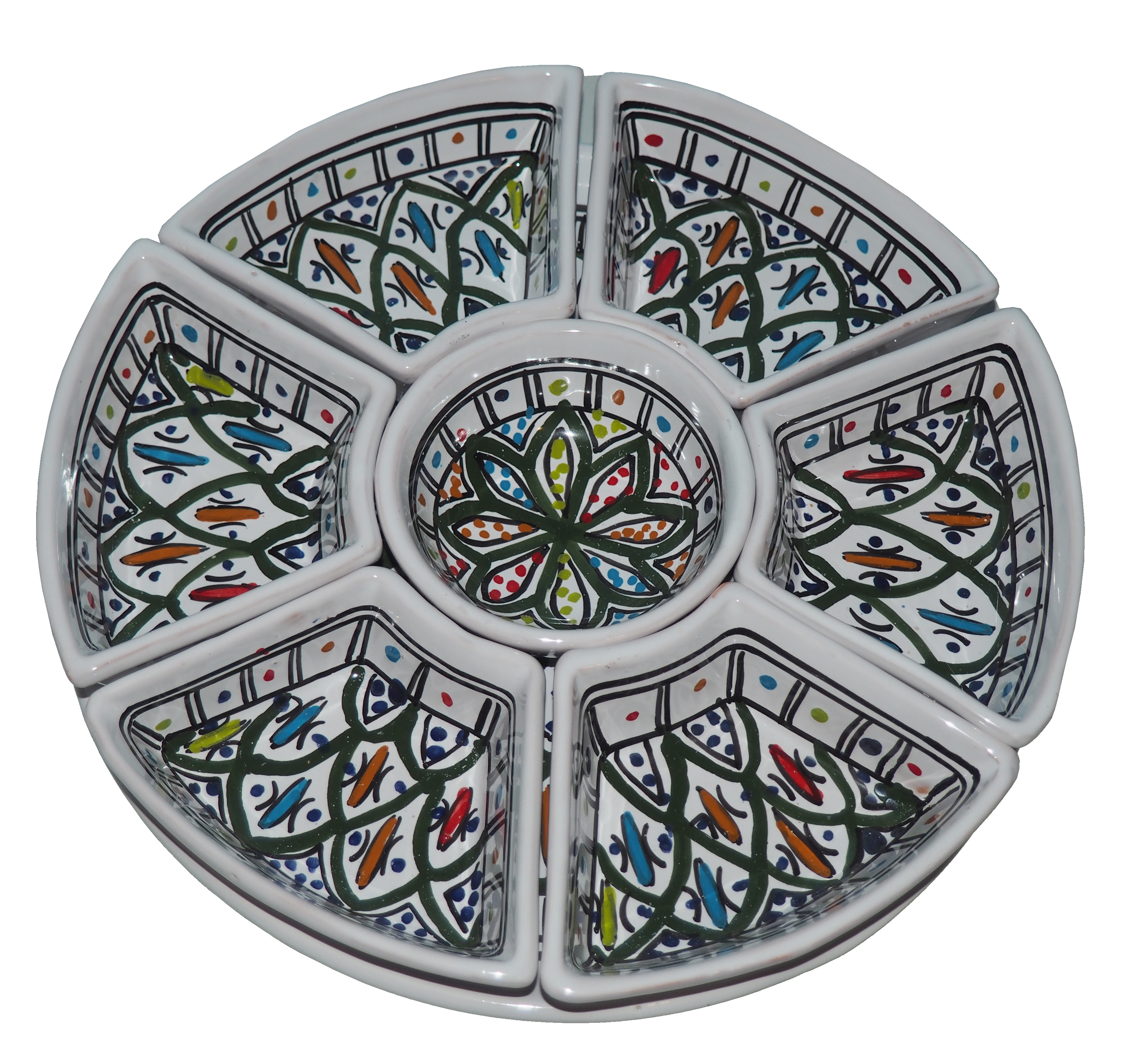 Arabski, ręcznie wykonany i ręcznie malowany zestaw na przystawki, przekąski, dodatki. Może także stanowić talerz dla wieloskładnikowego dania.