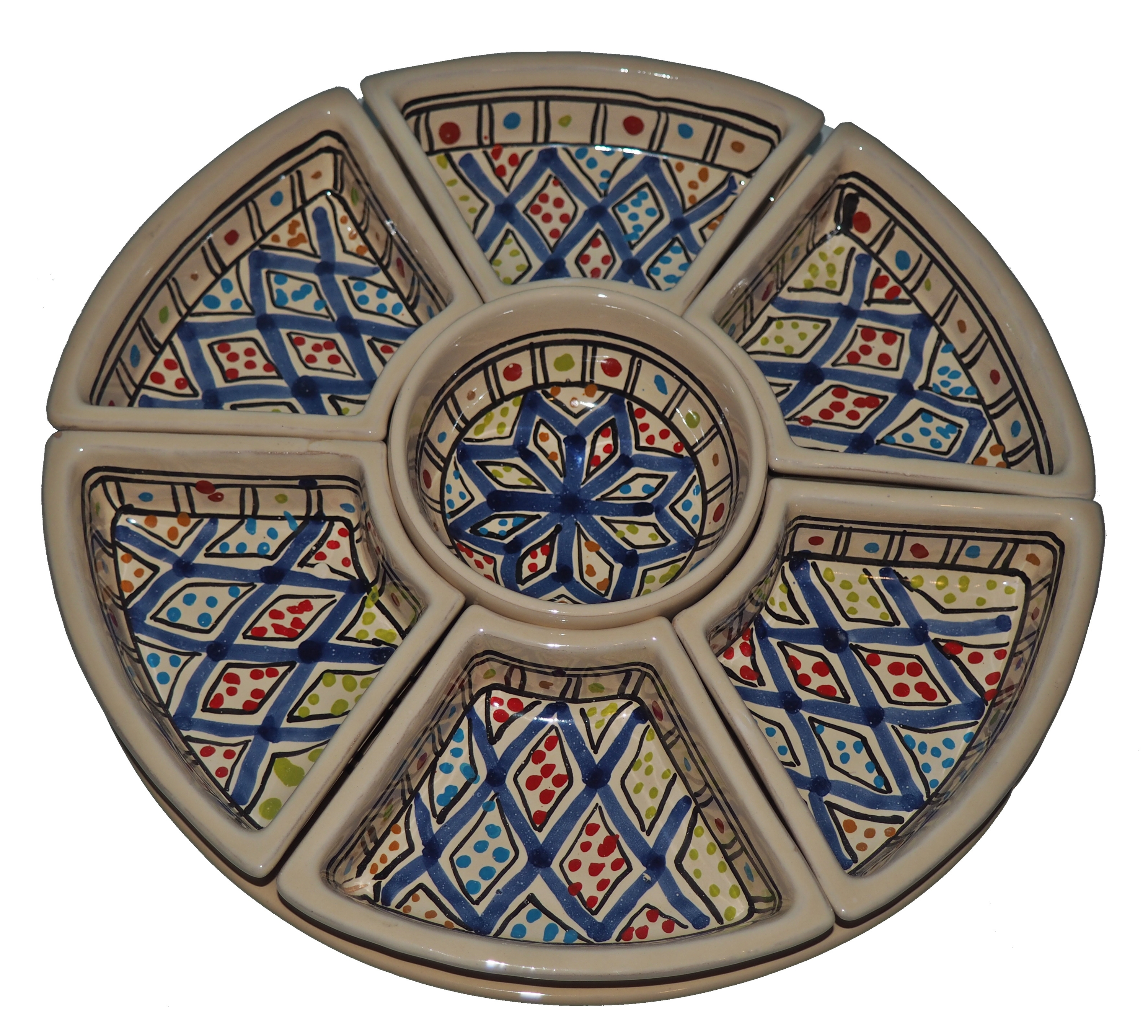 Arabski, ręcznie wykonany i ręcznie malowany zestaw na przystawki, przekąski, dodatki. Może także stanowić talerz dla wieloskładnikowego dania.