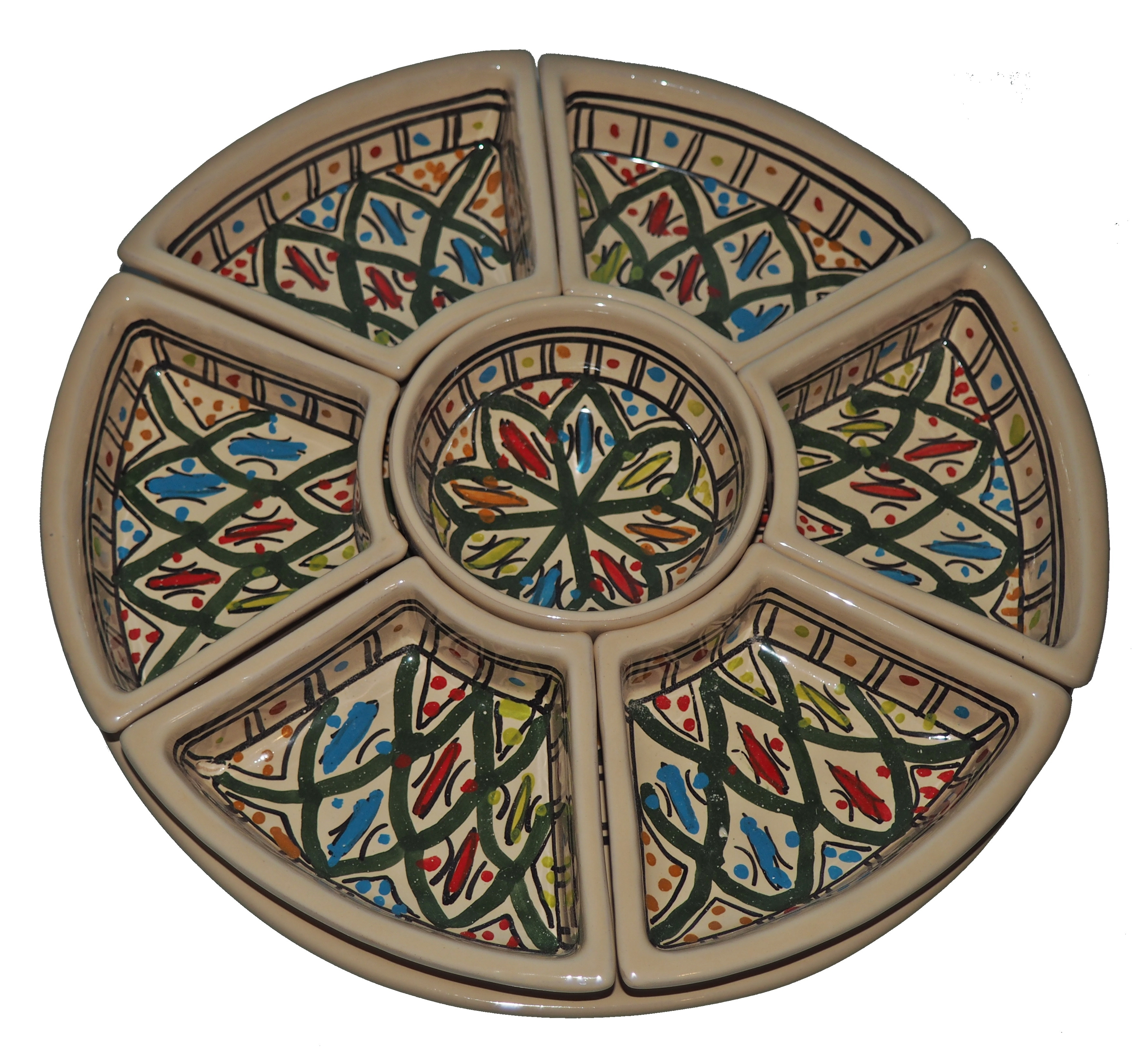 Arabski, ręcznie wykonany i ręcznie malowany zestaw na przystawki, przekąski, dodatki. Może także stanowić talerz dla wieloskładnikowego dania.