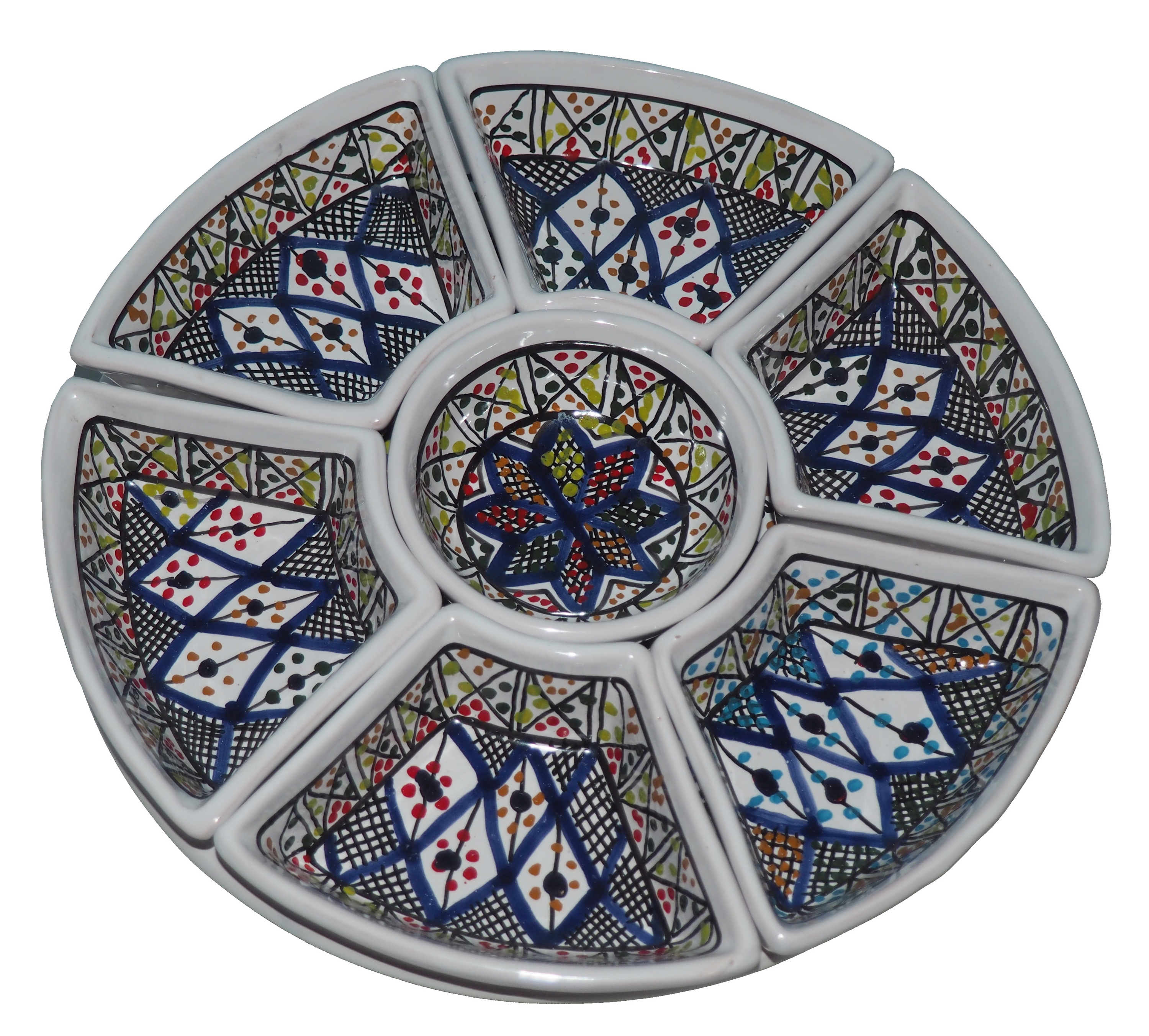Arabski, ręcznie wykonany i ręcznie malowany zestaw na przystawki, przekąski, dodatki. Może także stanowić talerz dla wieloskładnikowego dania.