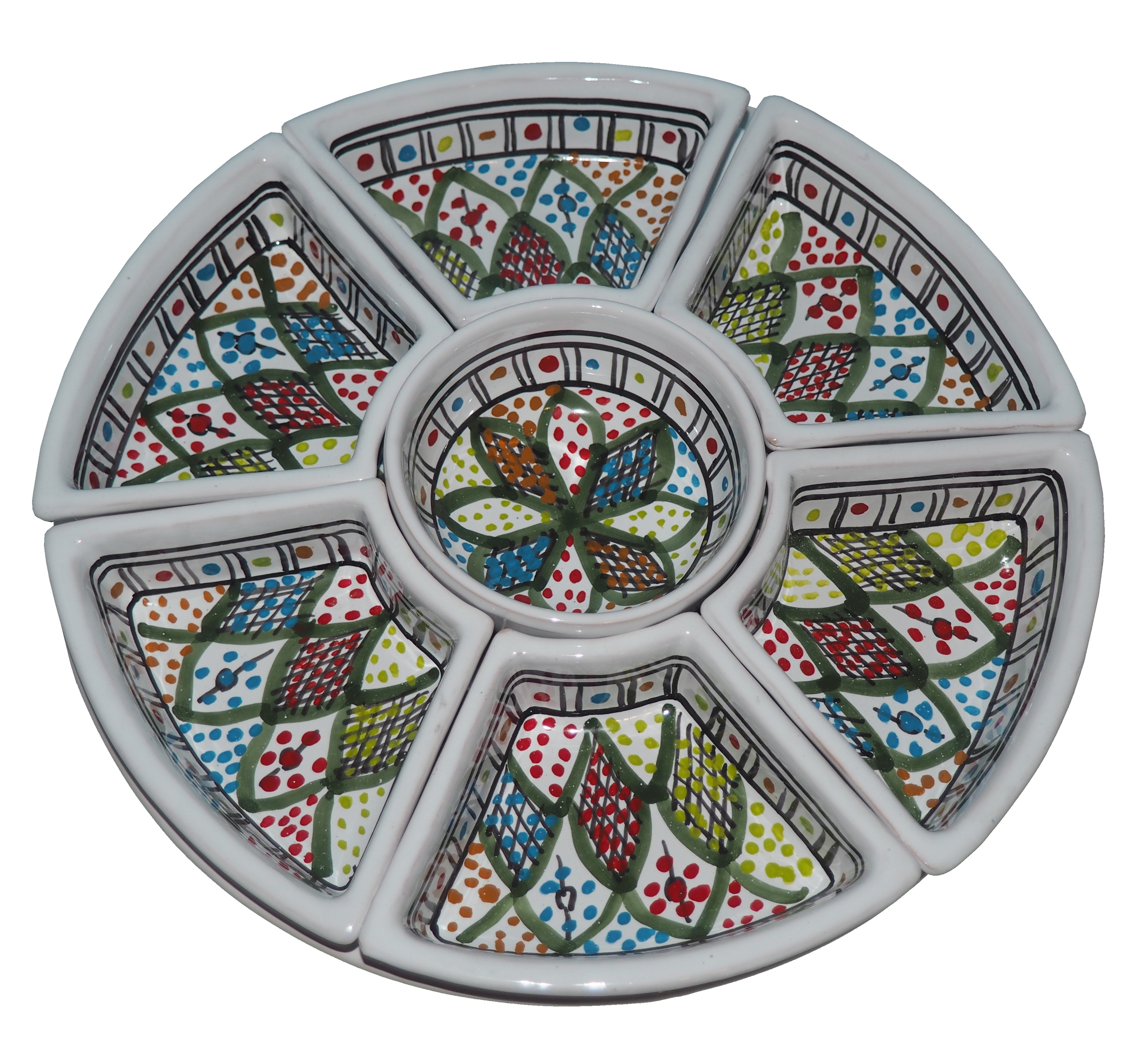 Arabski, ręcznie wykonany i ręcznie malowany zestaw na przystawki, przekąski, dodatki. Może także stanowić talerz dla wieloskładnikowego dania.