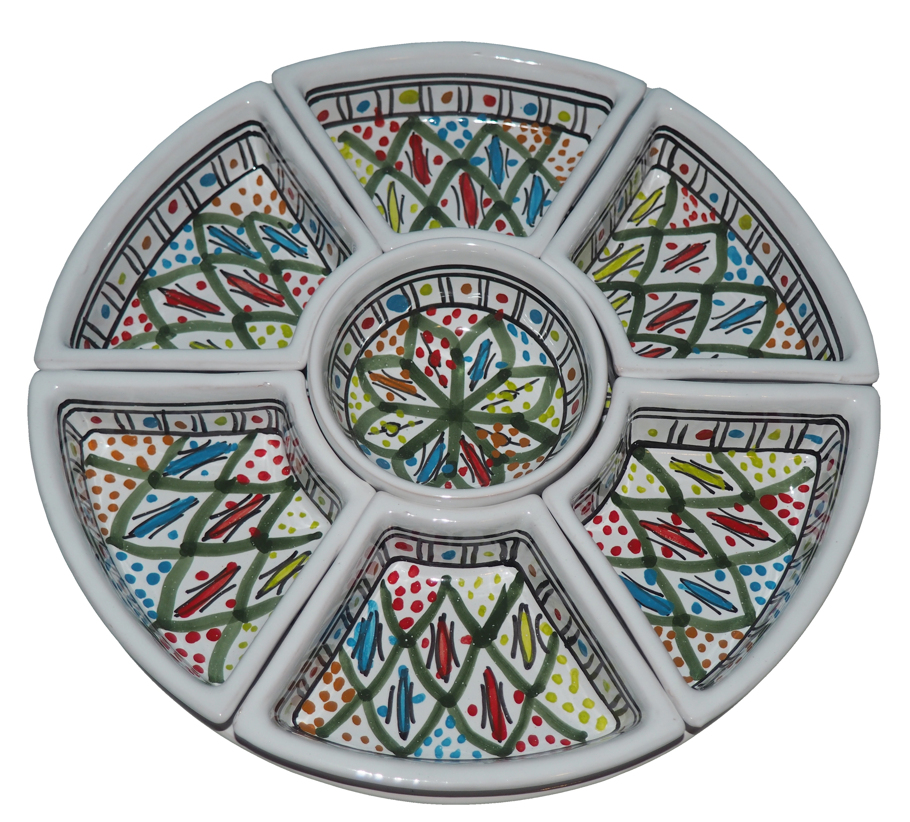 Arabski, ręcznie wykonany i ręcznie malowany zestaw na przystawki, przekąski, dodatki. Może także stanowić talerz dla wieloskładnikowego dania.