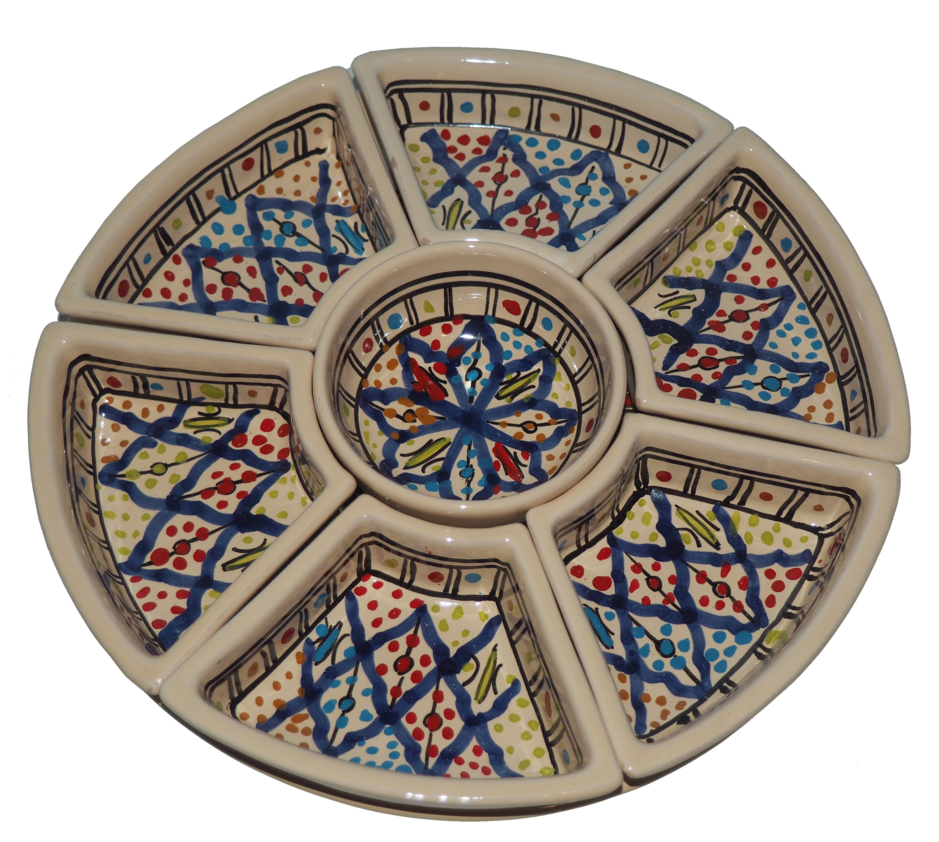 Arabski, ręcznie wykonany i ręcznie malowany zestaw na przystawki, przekąski, dodatki. Może także stanowić talerz dla wieloskładnikowego dania.