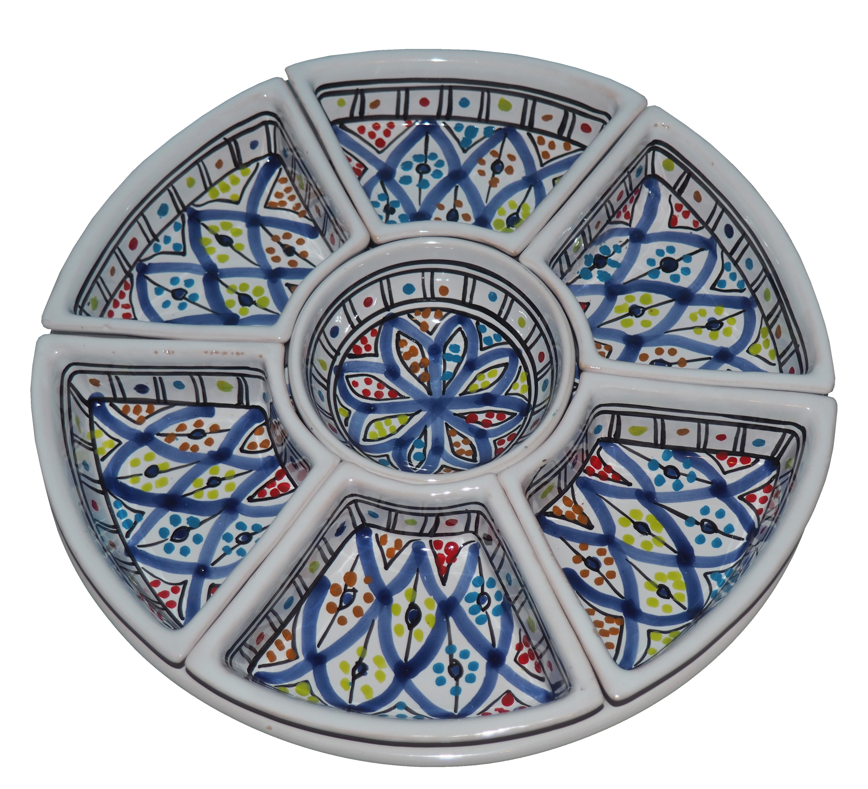 Arabski, ręcznie wykonany i ręcznie malowany zestaw na przystawki, przekąski, dodatki. Może także stanowić talerz dla wieloskładnikowego dania.