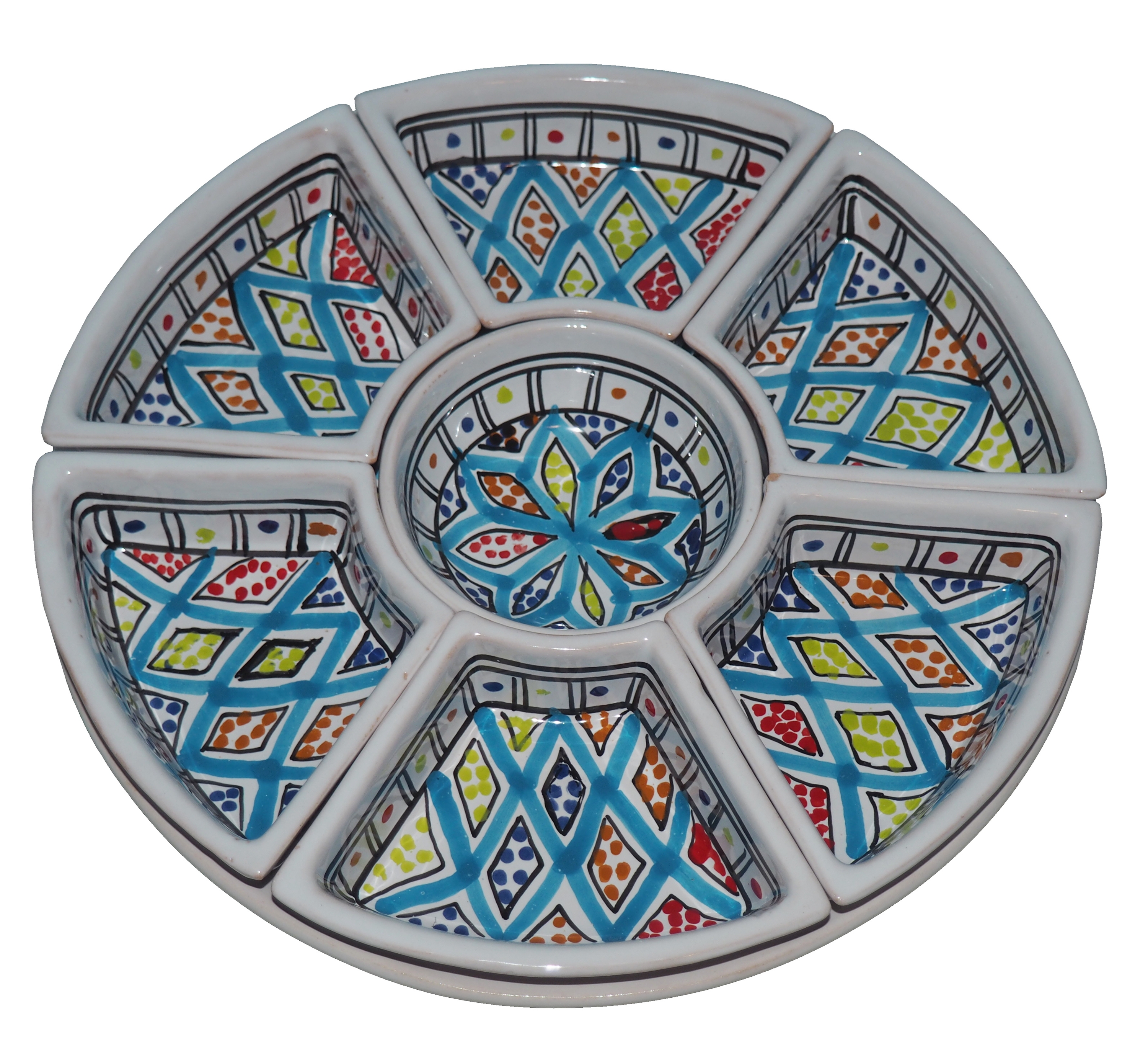 Arabski, ręcznie wykonany i ręcznie malowany zestaw na przystawki, przekąski, dodatki. Może także stanowić talerz dla wieloskładnikowego dania.