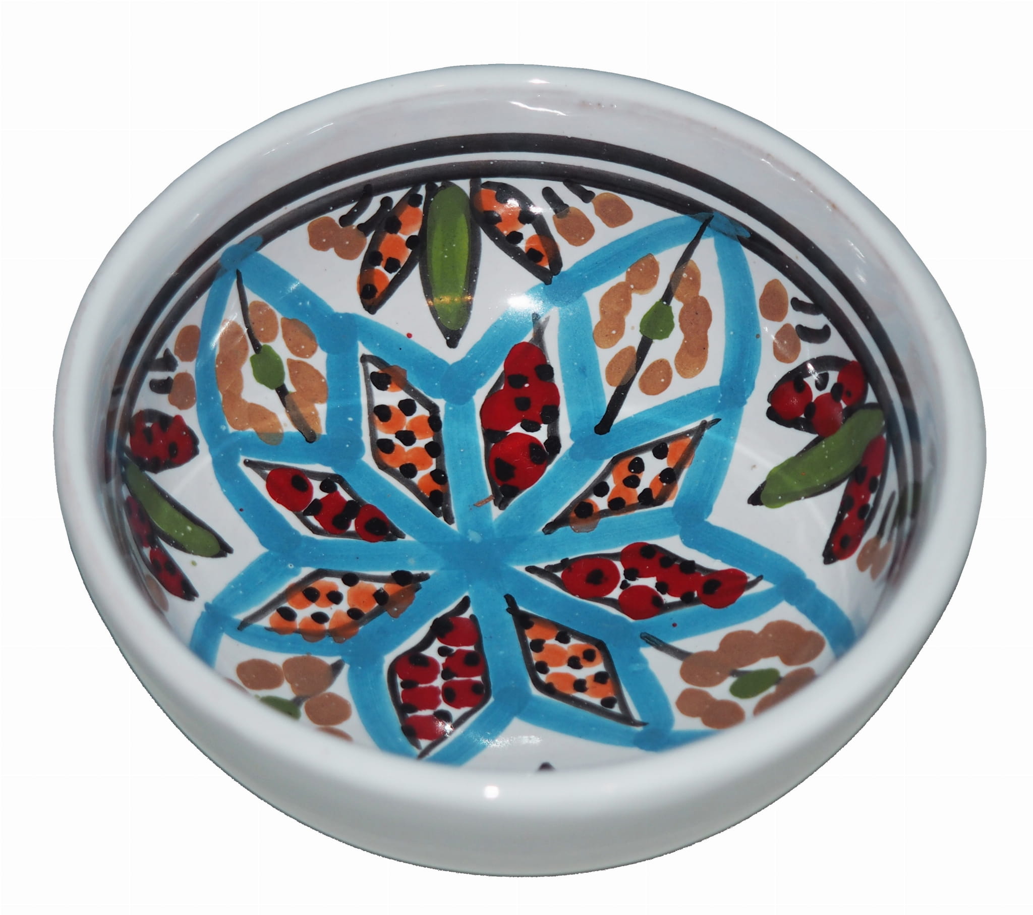 Zwraca uwagę piękne wzornictwo i bogata arabska kolorystyka. Miseczka malowana jest w berberyjskie wzory. Przepiękna, niebanalna ozdoba Twojego stołu - śliczna miseczka prosto z Tunezji.